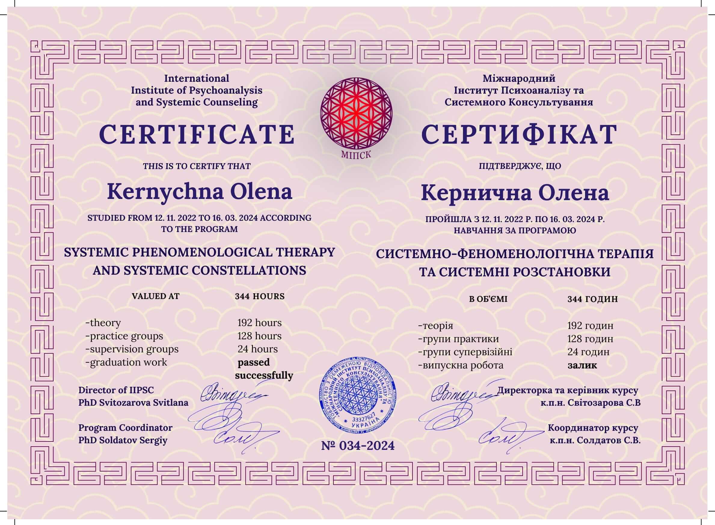 - Українська Асоціація Системних Розстановок – базовий курс 344години;