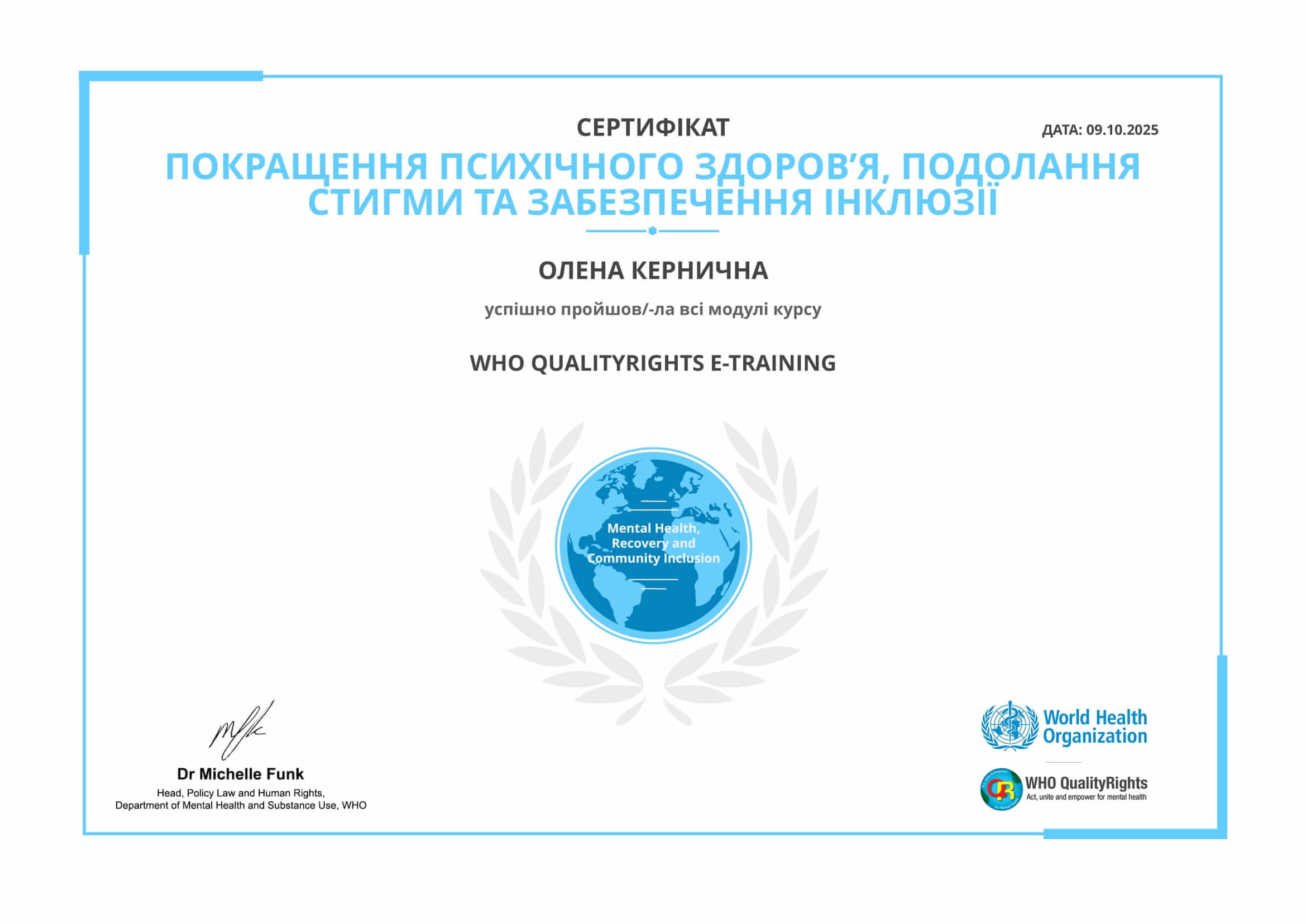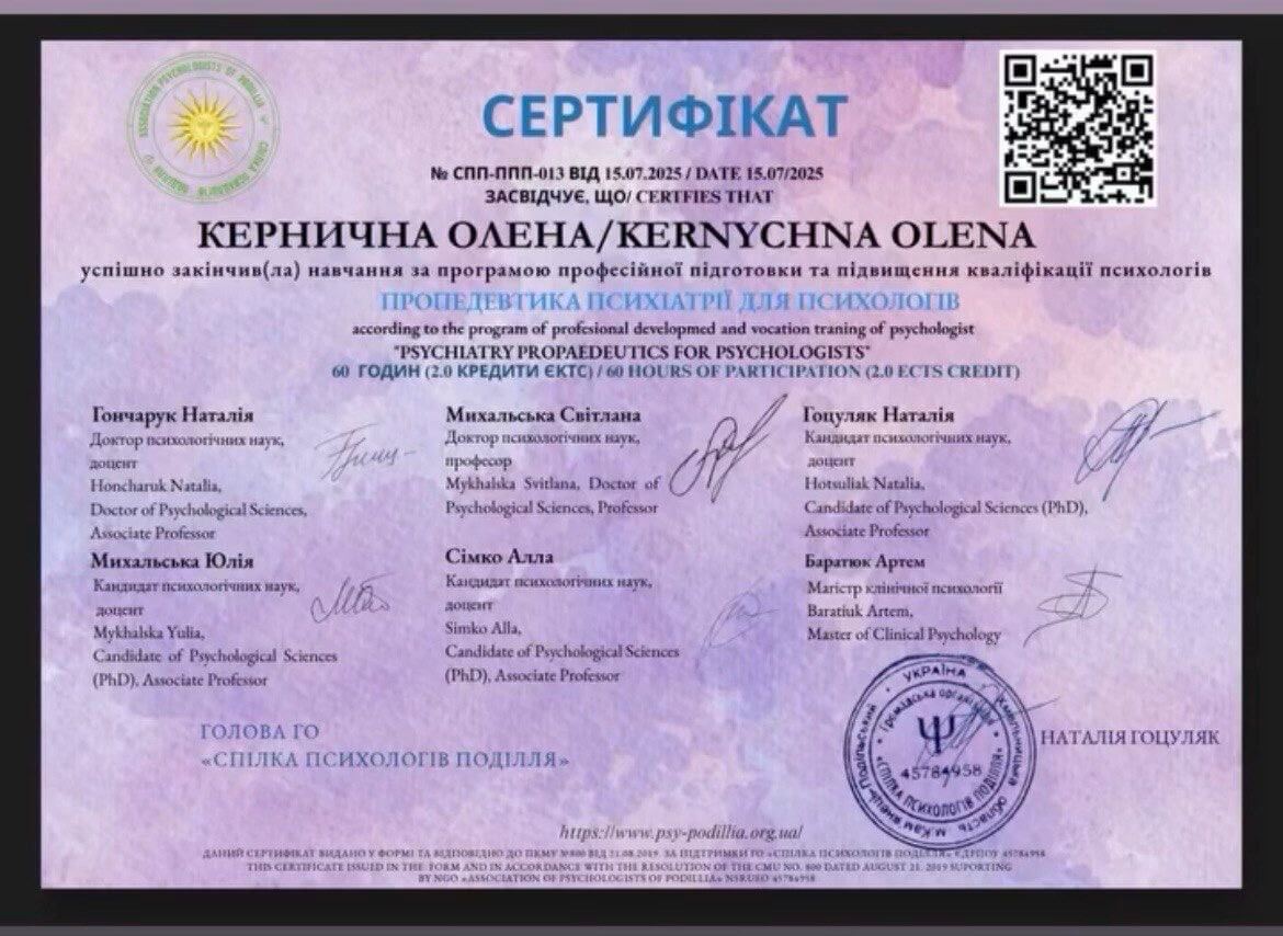- Спілка психологів Поділля – Пропедевтика психіатрії для психологів 60 годин;