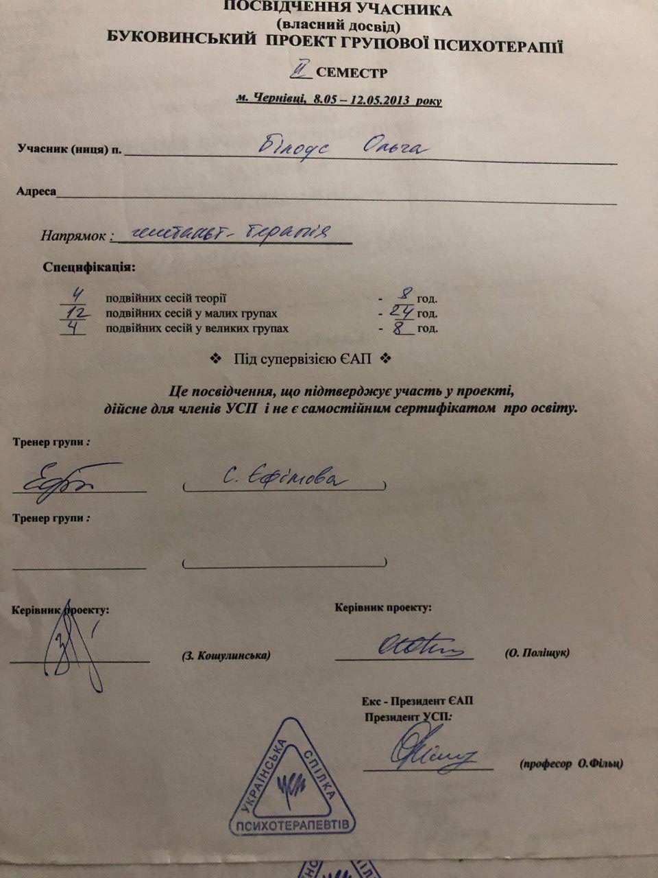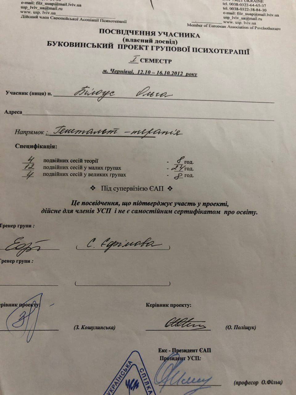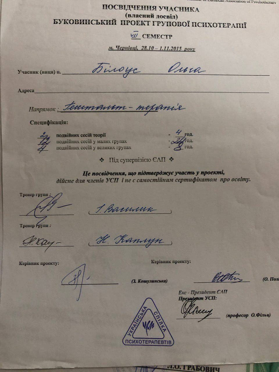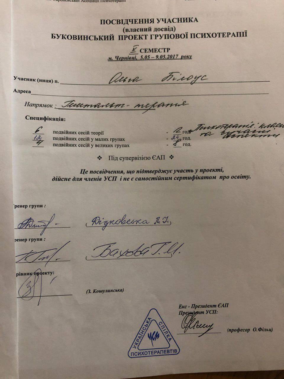 2012–2017 — УСП, Буковинський проєкт, напрямок — гештальт-терапія
