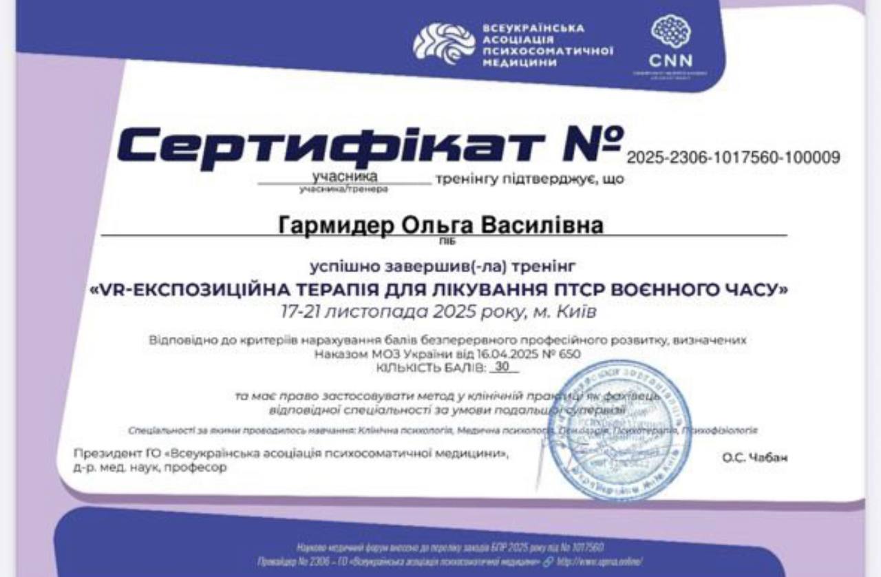 Мій професійний розвиток у психології почався ще у 2004 році з базової освіти в галузі медичної психології. Згодом я пройшла багаторічну підготовку в гештальт-підході (УСП, УПУ), доповнюючи її спеціалізованими семінарами, пропедевтикою з психіатрії та участю в інтенсивних програмах. Я постійно підтримую якість своєї роботи через супервізійні групи та особисту терапію, бо вважаю, що терапевт має бути в процесі навчання й осмислення так само, як і його клієнти