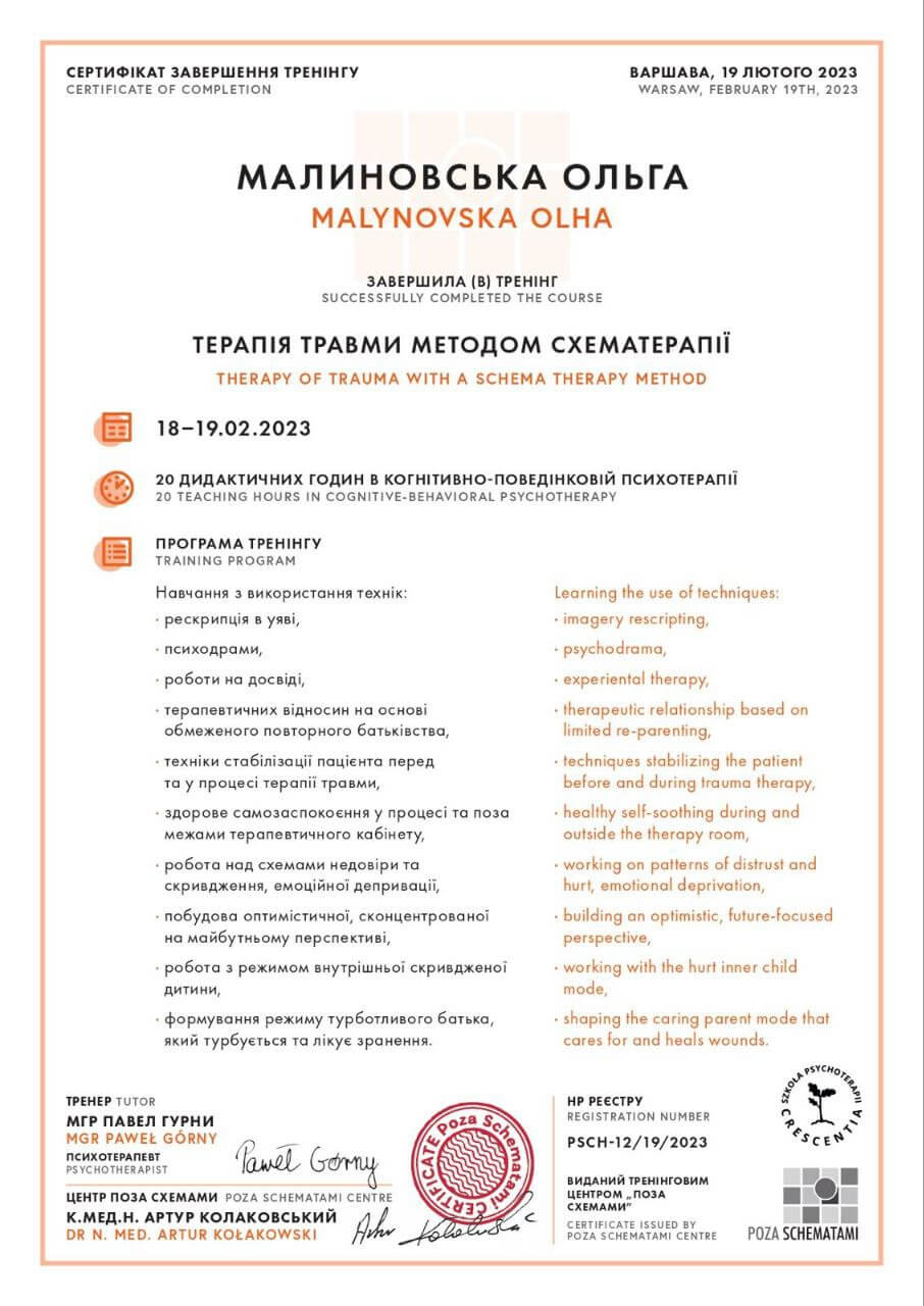 - лютий 2023 – брала участь в навчальному тренінгу «Терапія травми методом схематерапії»;