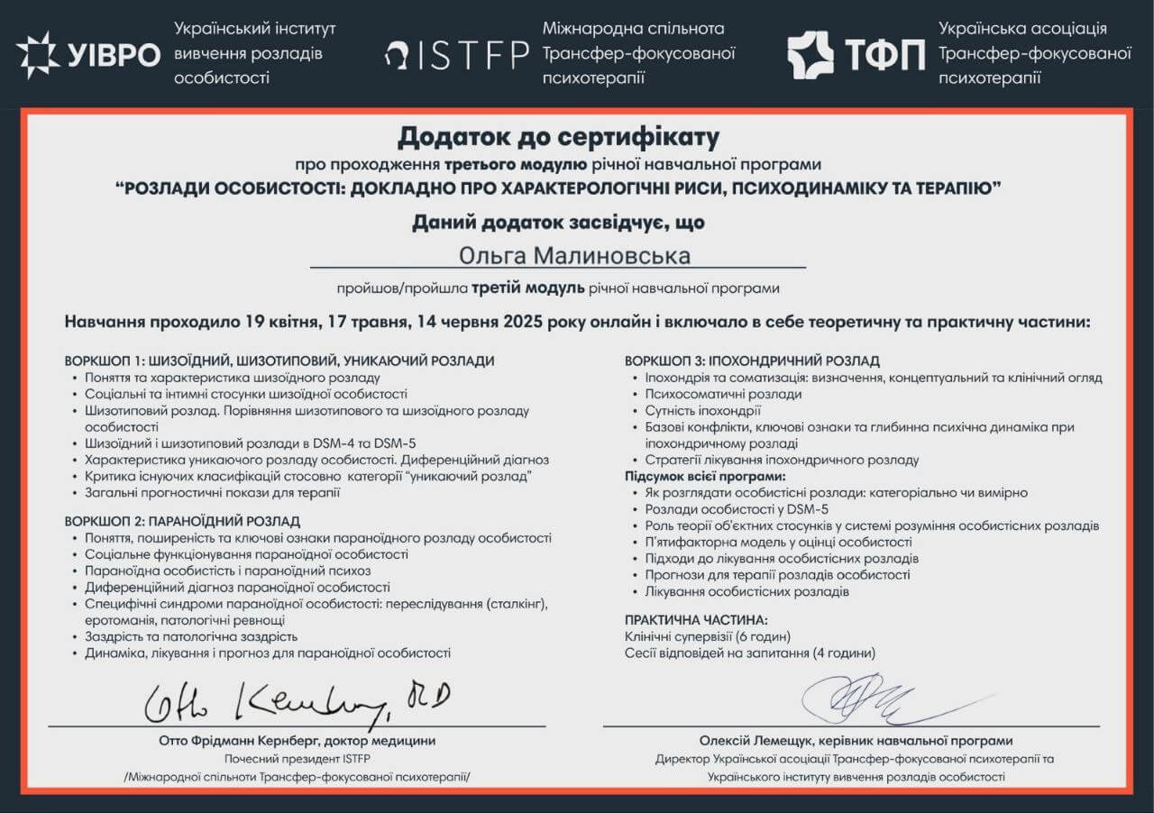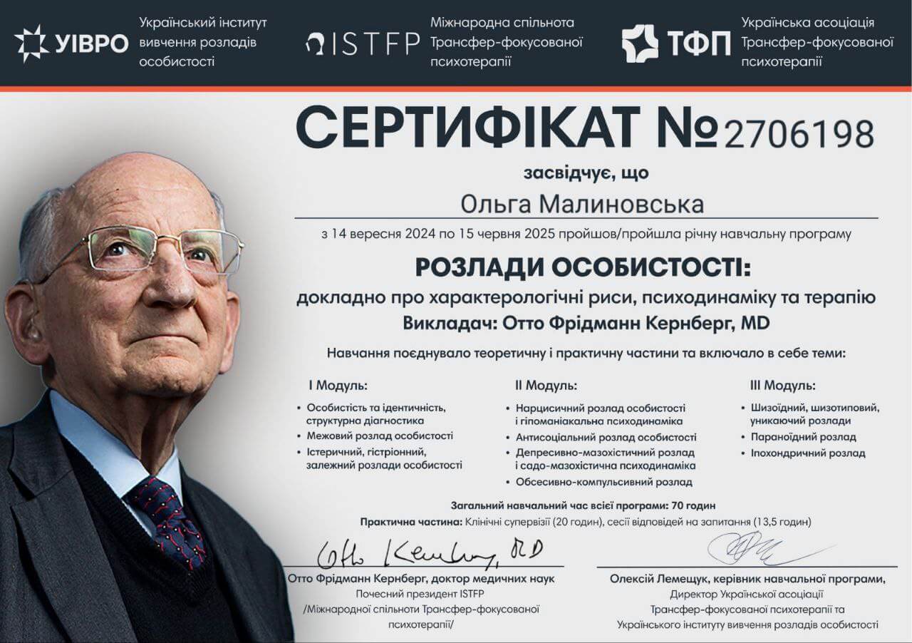 - вересень 2024 – червень 2025 – пройшла річне навчання Отто Кернберга “Розлади особистості”.