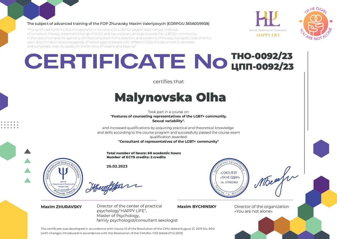- лютий 2023 – закінчила курс “Features of counseling representatives of the LGBT+ community Sexual variability»;