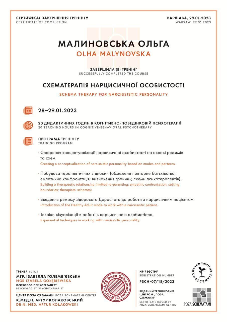 - січень 2023 – брала участь у навчальному тренінгу «Схематерапія нарцистичної особистості»;