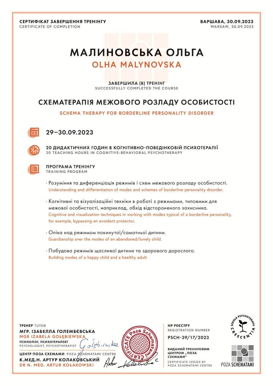 - вересень 2023 – брала участь в навчальному тренінгу «Схематерапія межового розладу особистості»;