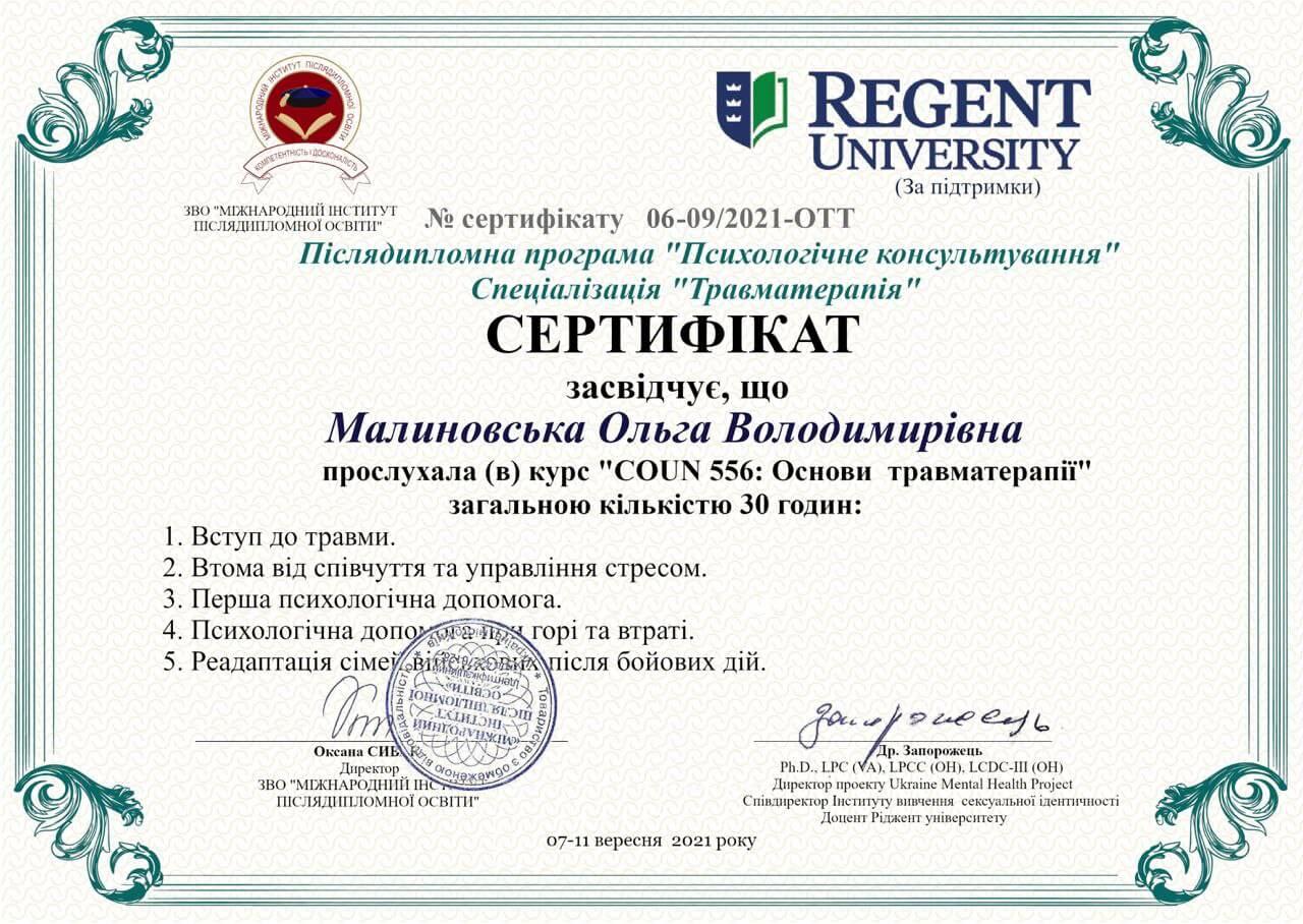 - вересень 2021 – закінчила курс “Основи травматерапії” в Міжнародному інституті післядипломної освіти за підтримки Regent University USA;
