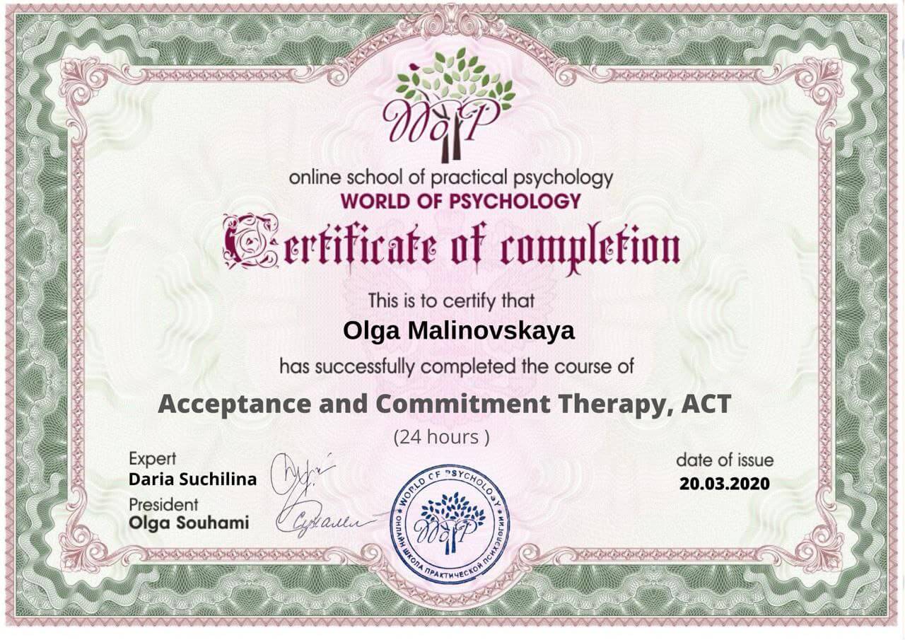 - березень 2020 – закінчила базовий курс по терапії прийняття і відповідальності (АСТ);