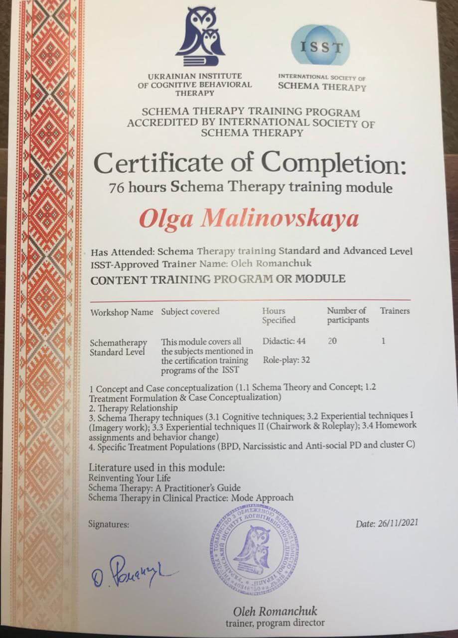 - листопад 2021 – пройшла навчання по схема-терапії в УІКПТ;