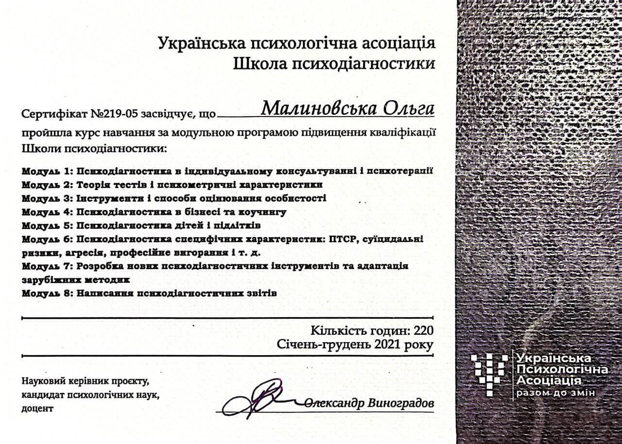 - грудень – жовтень 2021 – закінчила курс підвищення кваліфікації у Школі психодіагностики УПА “Психодіагностика специфічних характеристик” (220 годин);