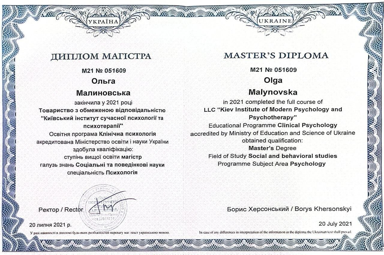 2021 – Київський університет сучасної психології і психотерапії, магістр психології, освітня програма – клінічна психологія.