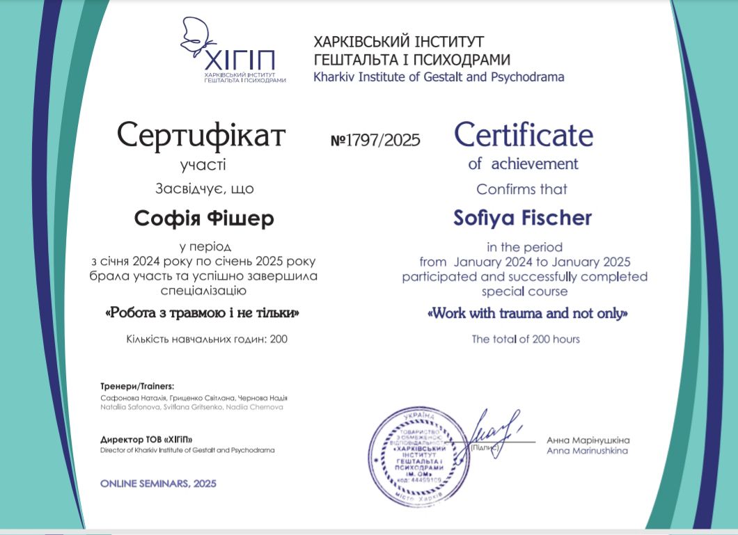 2024–2025 — Спеціалізація «Робота з травмою і не тільки», Харківський інститут гештальту і психодрами