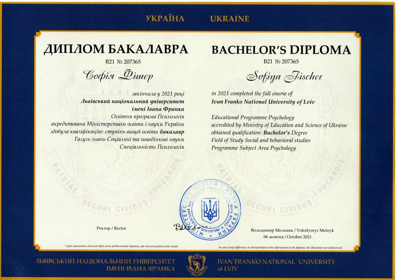 2021 — Бакалавр психології, Львівський національний університет імені Івана Франка