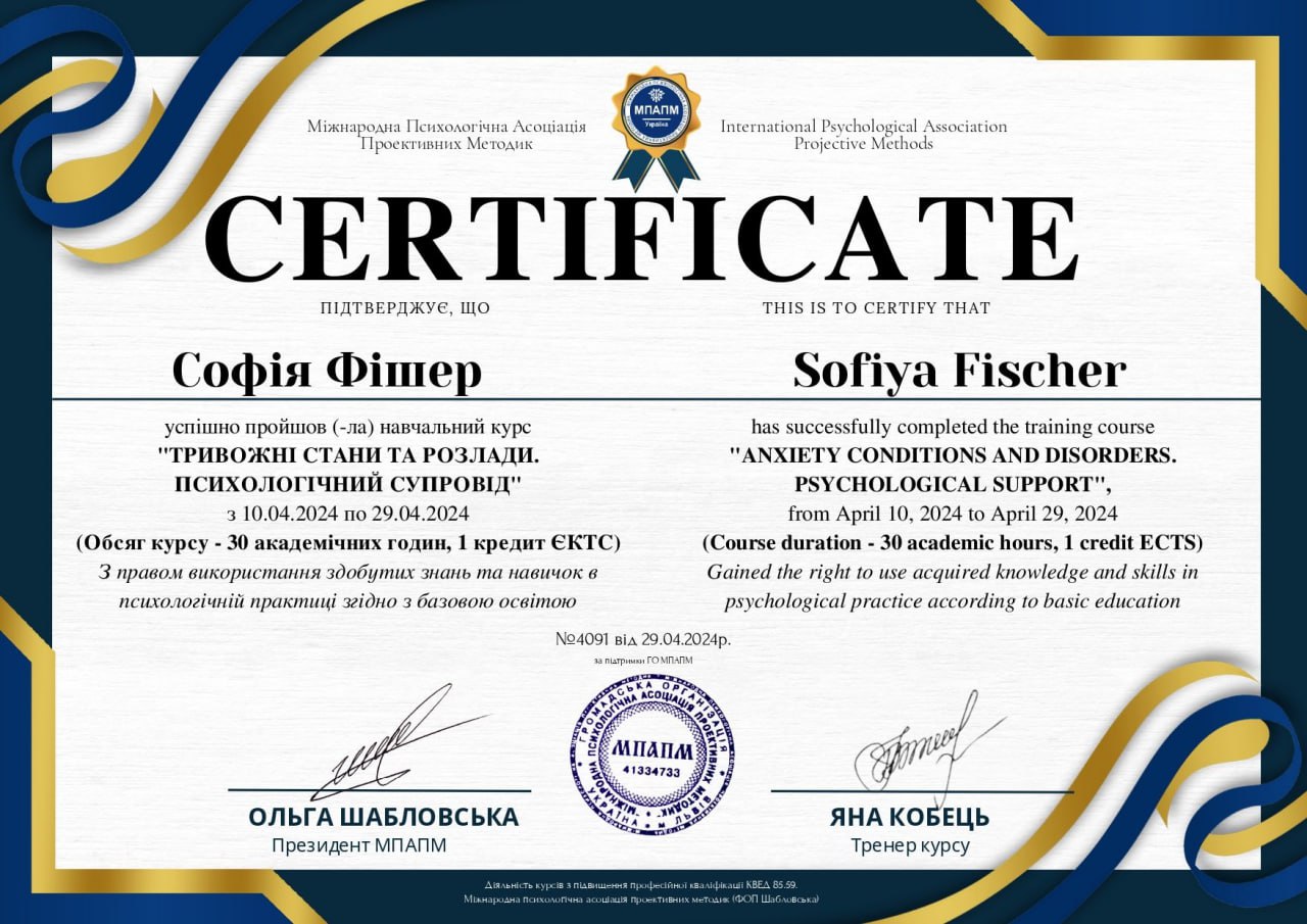 2024 — Курс «Тривожні стани та розлади. Психологічний супровід», Міжнародна психологічна асоціація проективних методик