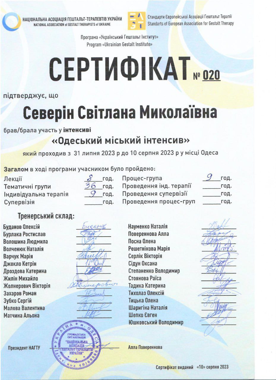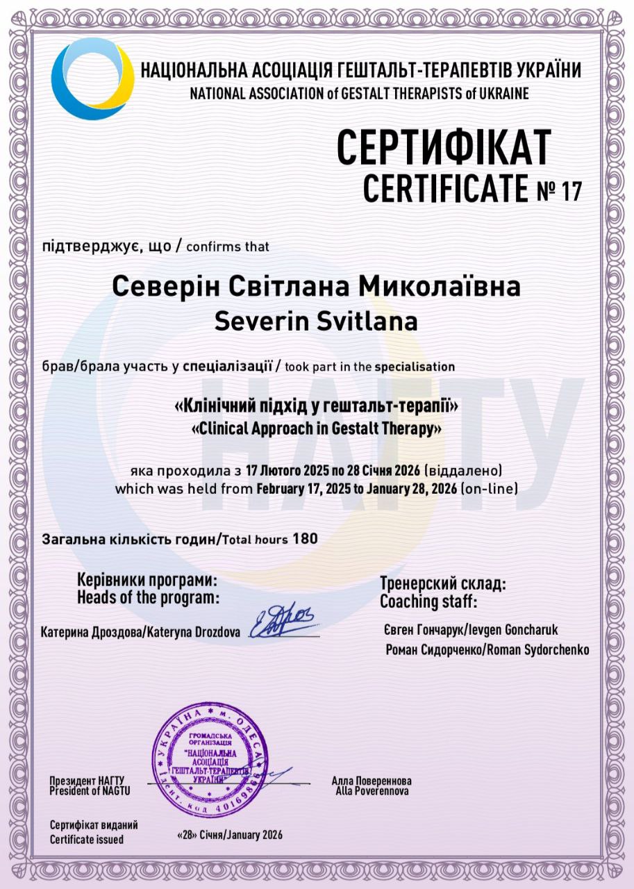 2025–2026 — Спеціалізація «Клінічний підхід у гештальт-терапії», Національна асоціація Гештальт-терапевтів України