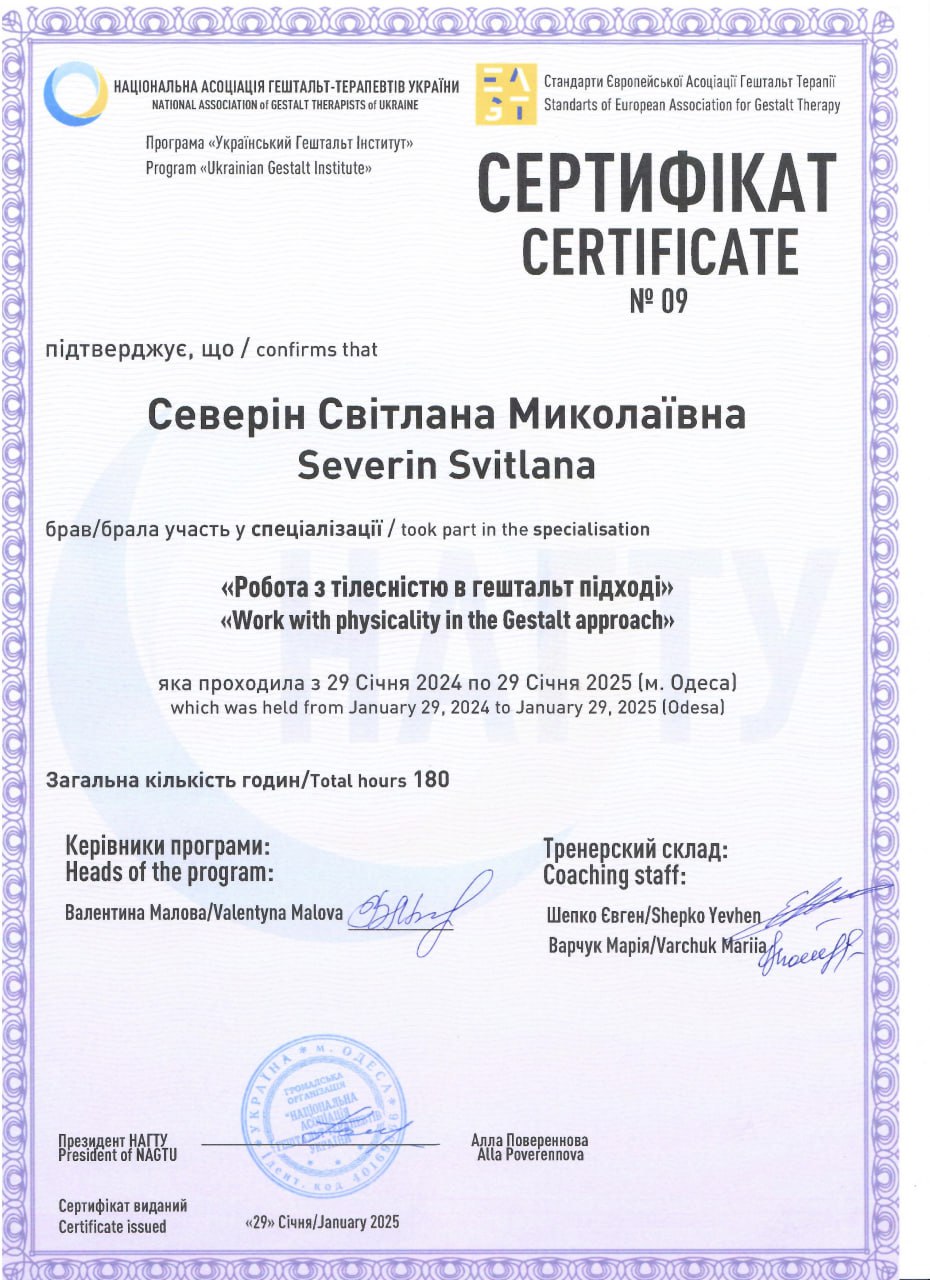 2025 — Спеціалізація «Робота з тілесністю в гештальт-підході», Український Гештальт Інститут, Національна асоціація гештальт-терапевтів України