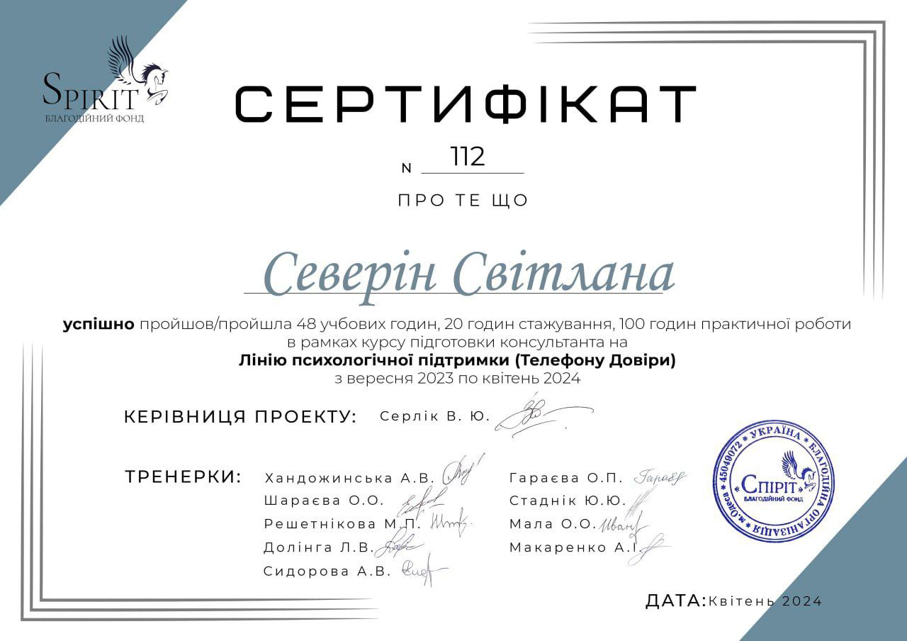 2024 — Курс підготовки консультанта на Лінію психологічної підтримки (Телефон Довіри), Благодійний фонд «Спиріт»