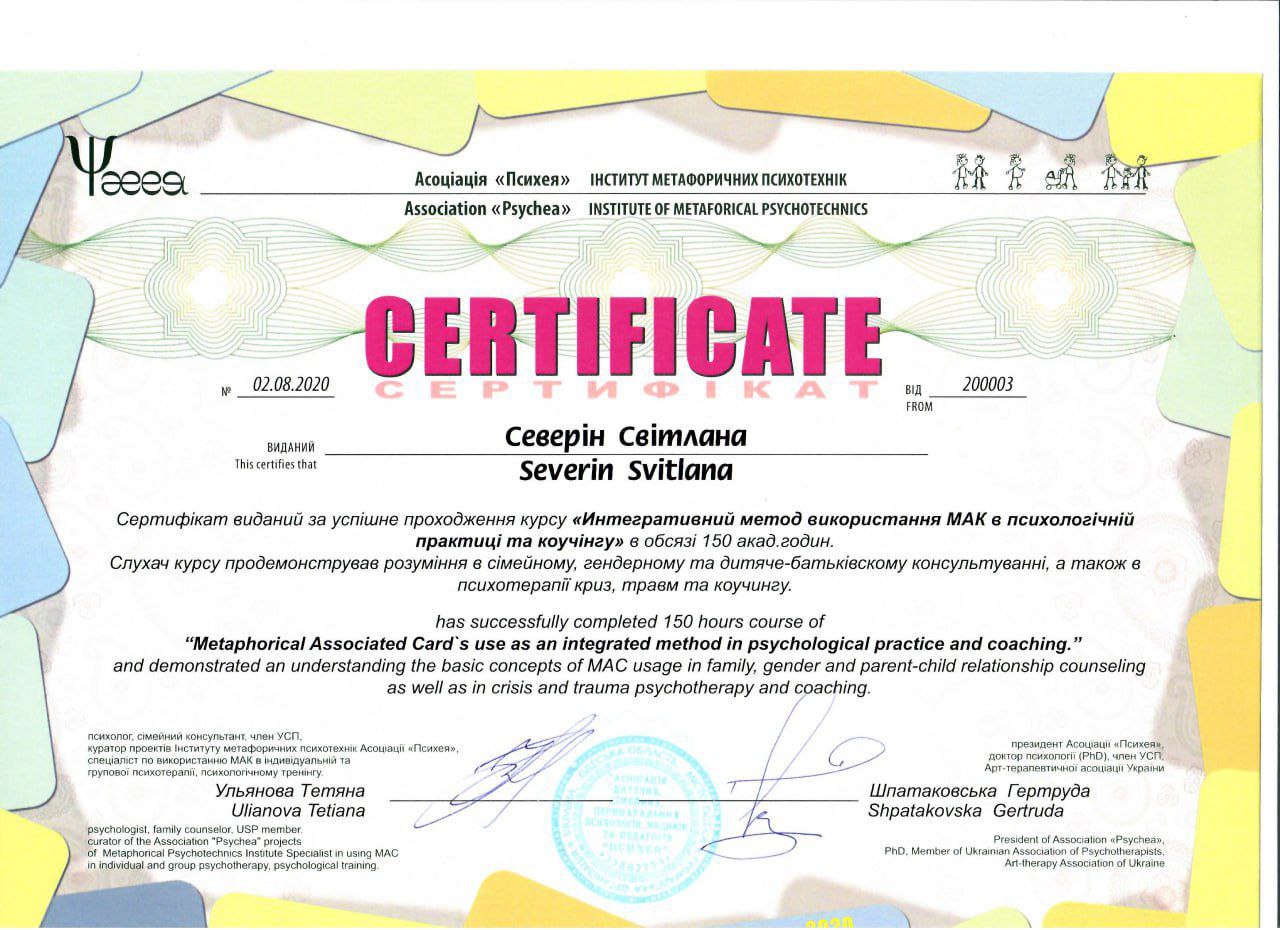 2020 — Курс «Інтегративний метод використання МАК в психологічній практиці та коучингу», Асоціація «Психея», Інститут метафоричних психотехнік