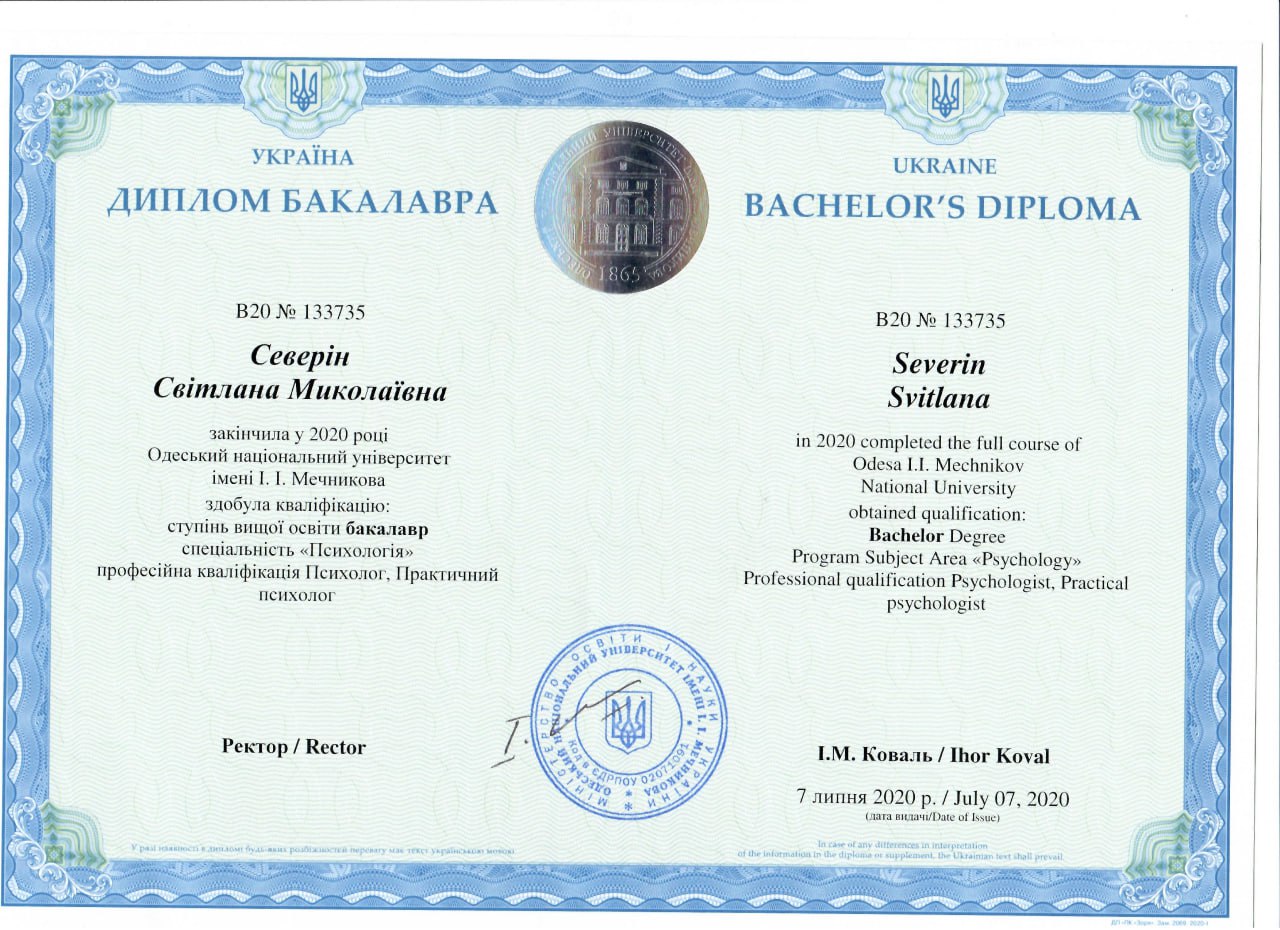 2020 — Бакалавр психології, спеціальність «Психологія», кваліфікація: психолог, практичний психолог, Одеський національний університет імені І. І. Мечникова