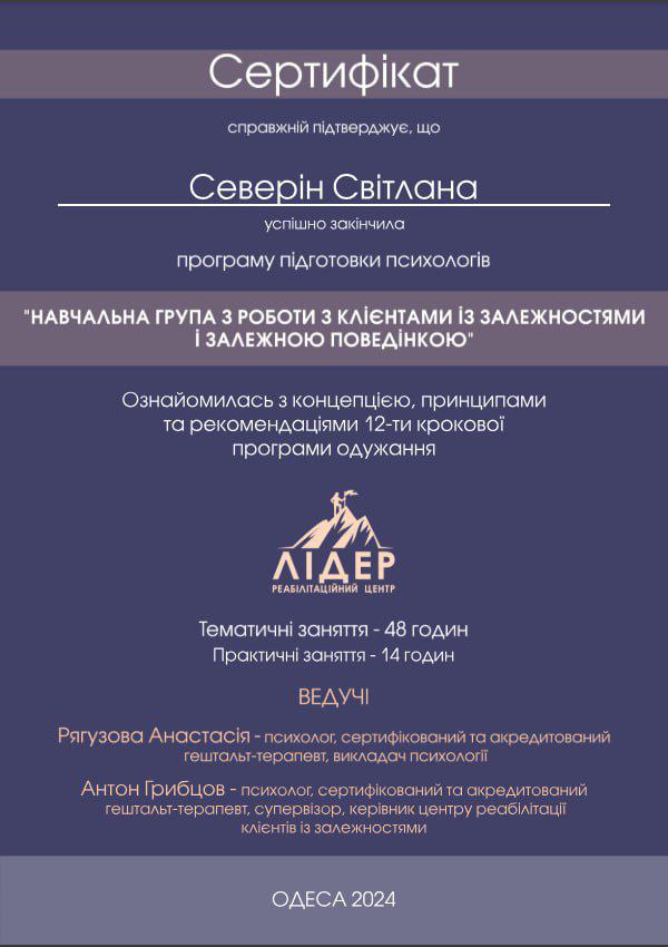 2024 — «Навчальна група з роботи з клієнтами із залежностями і залежною поведінкою», Центр реабілітації «Лідер»