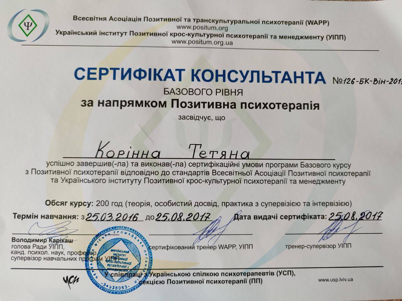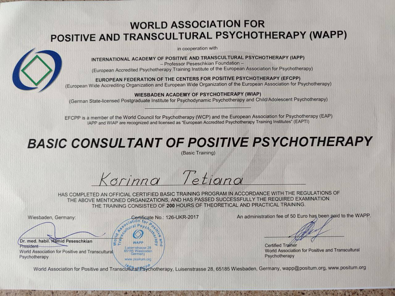 - Консультант у методі Позитивної психотерапії, Український інститут позитивної та крос-культурної психотерапії.