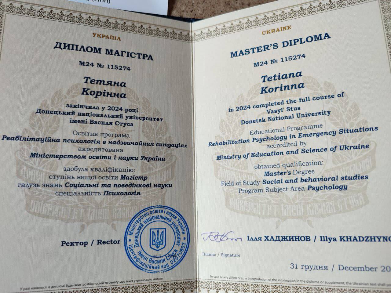 - Магістр психології («Реабілітаційна психологія в надзвичайних ситуаціях»), Донецький національний університет імені Василя Стуса.