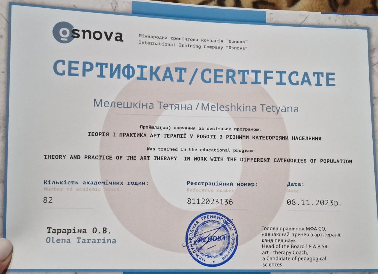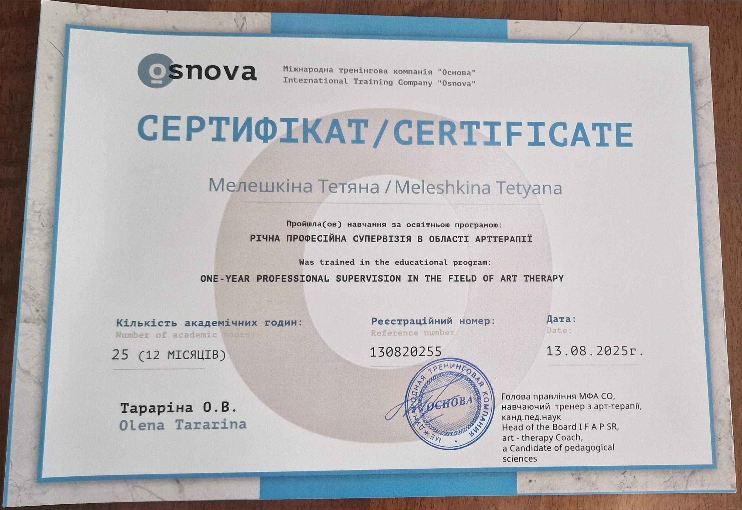 2025 — Річна професійна супервізія в області арт-терапії, Міжнародна тренінгова компанія «Основа»