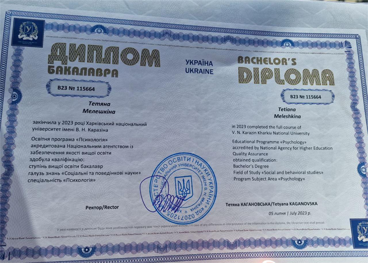 2023 — Бакалавр психології, Харківський національний університет імені В. Н. Каразіна