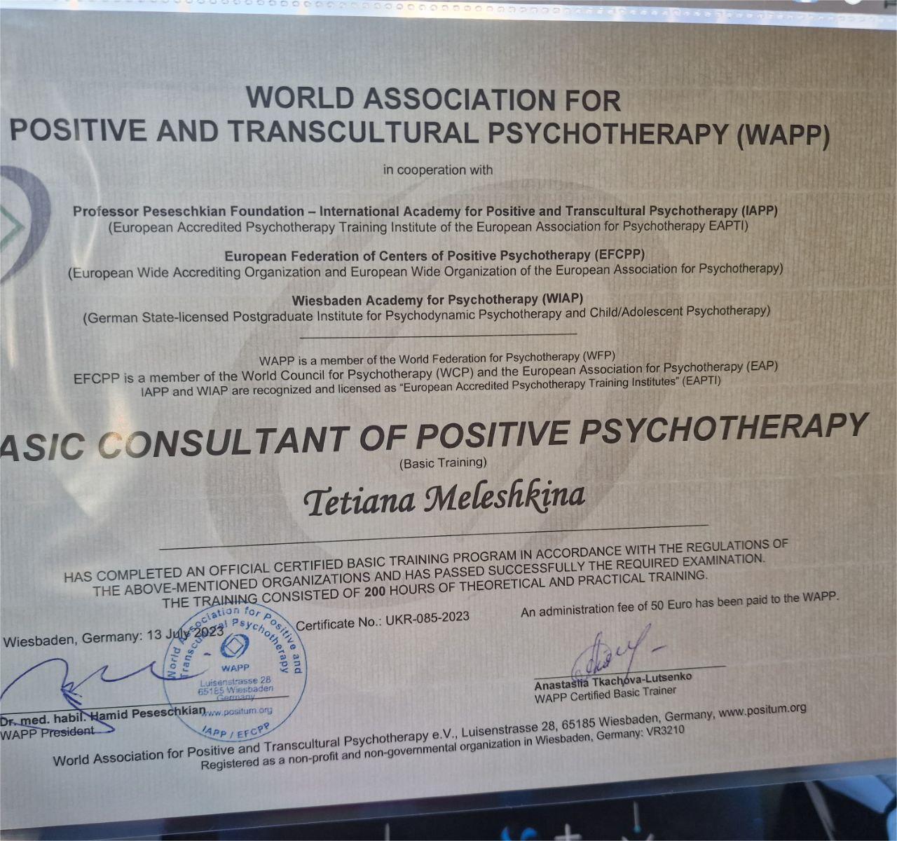 2023 — Basic Consultant of Positive Psychotherapy, World Association for Positive and Transcultural Psychotherapy (WAPP)