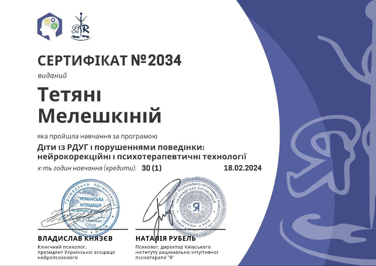 2024 — Діти з РДУГ і порушеннями поведінки: нейрокорекційні та психотерапевтичні технології, Українська асоціація нейропсихологів, Київський інститут раціонально-інтуїтивної психотерапії «Я»