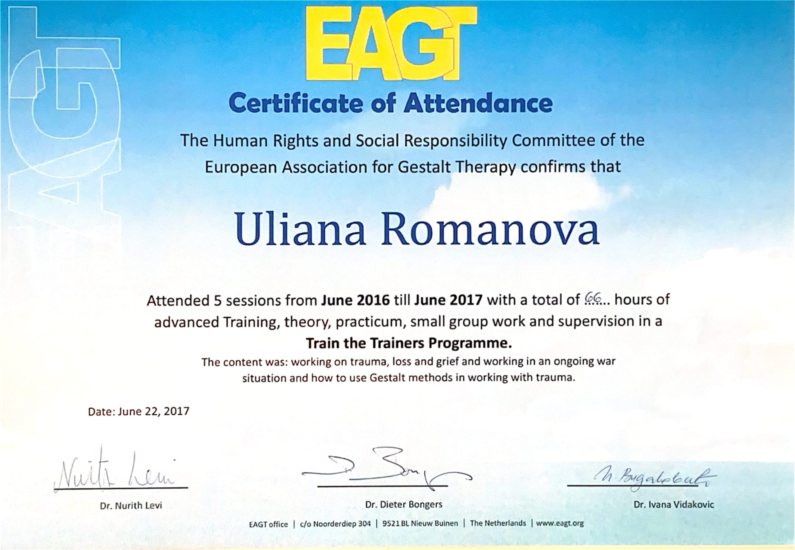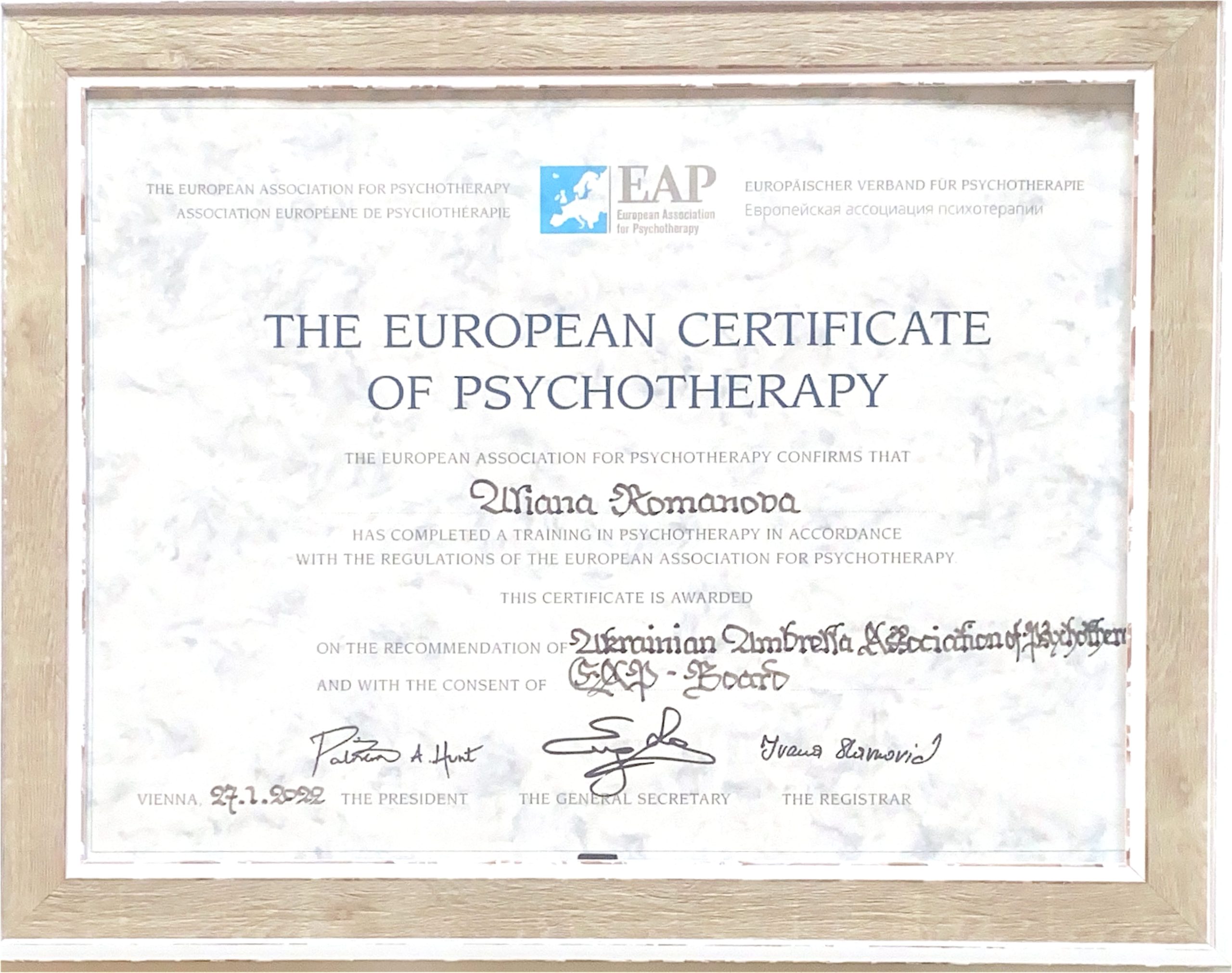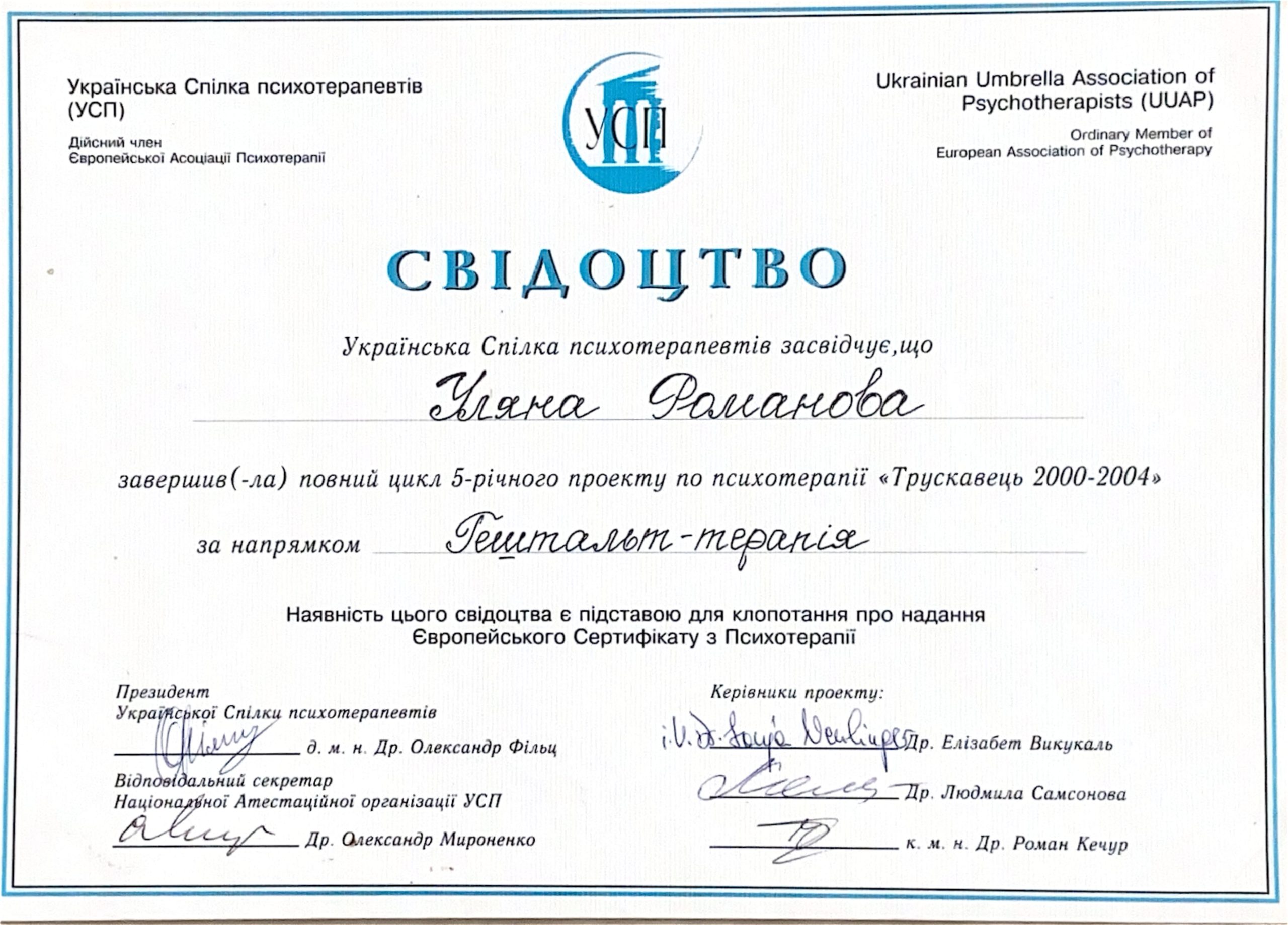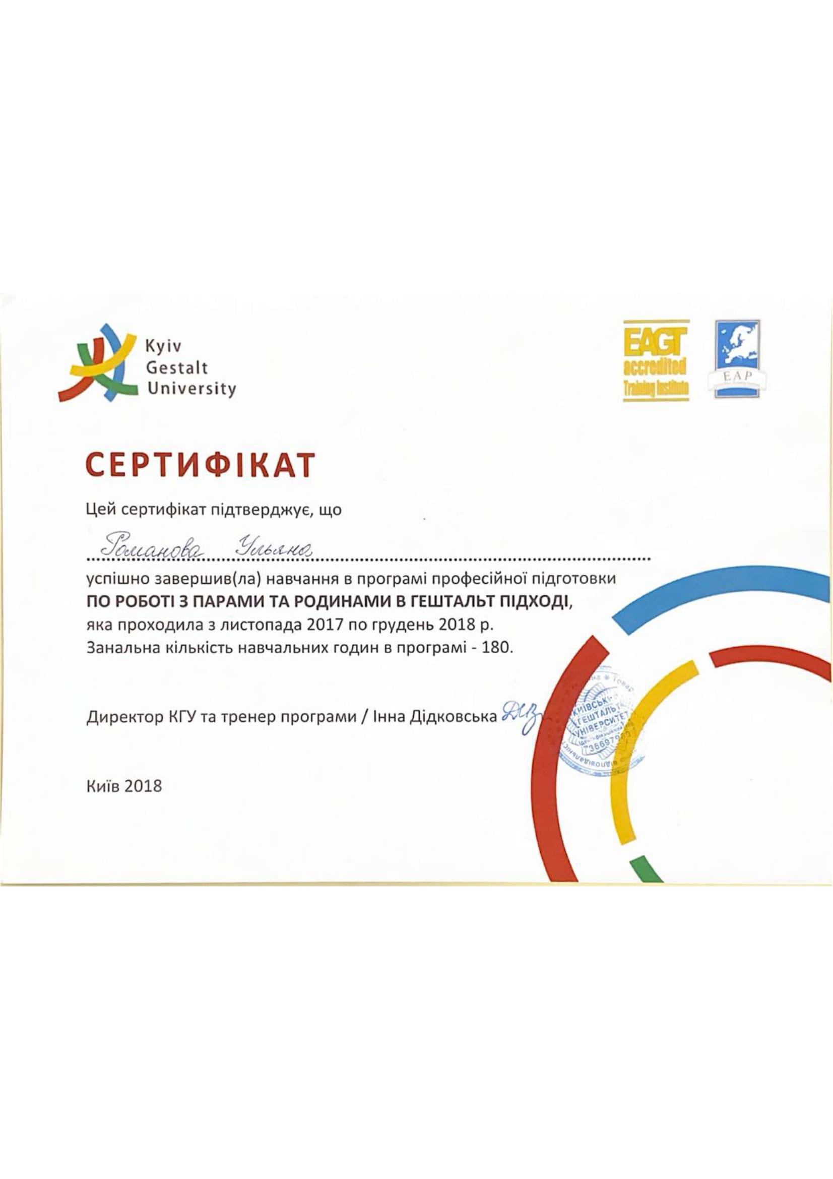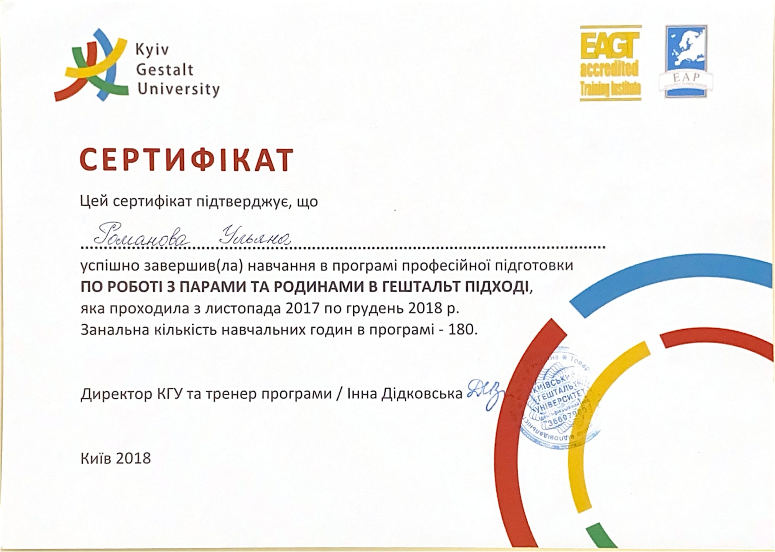 2022 р. – Європейський сертифікат з гештальтерапіі