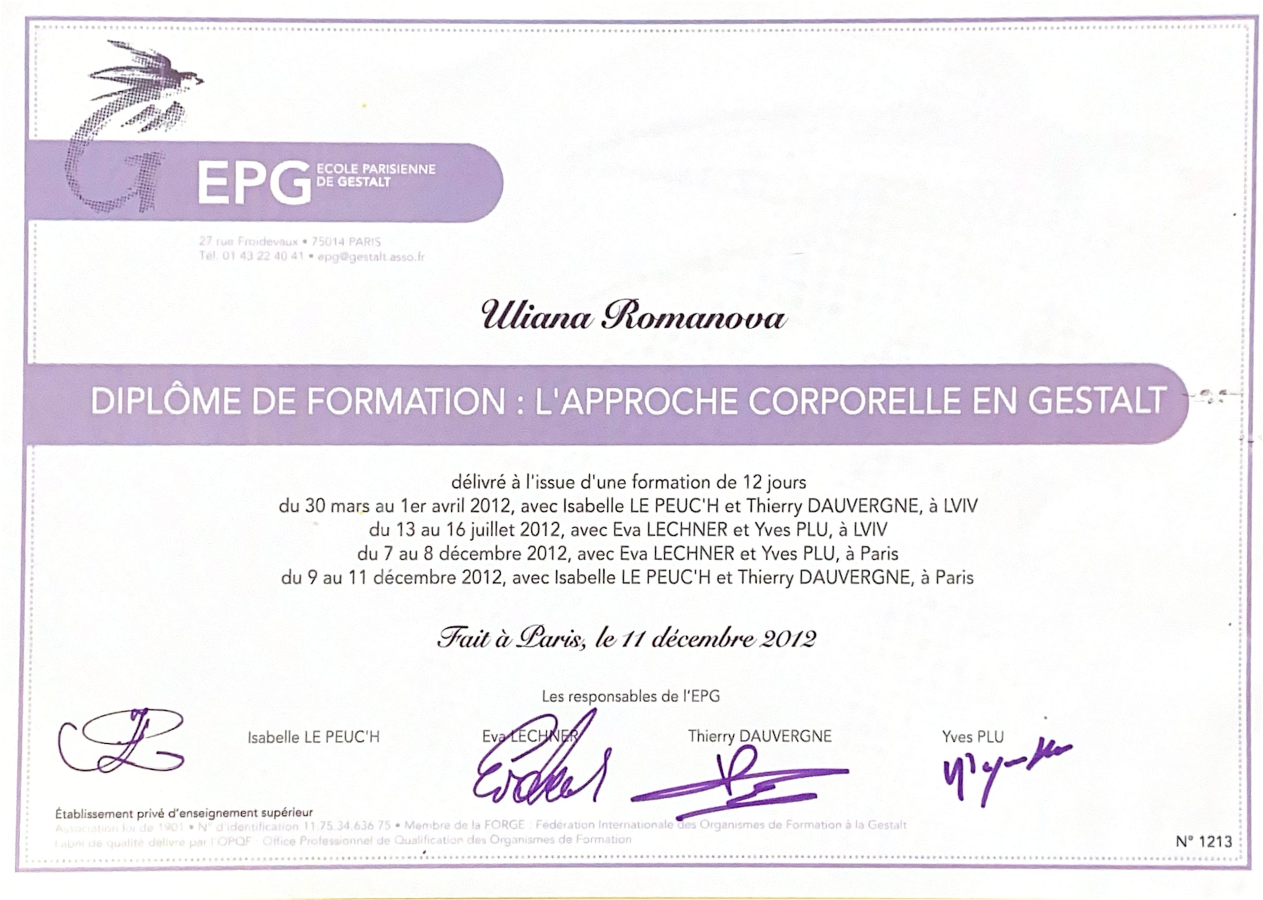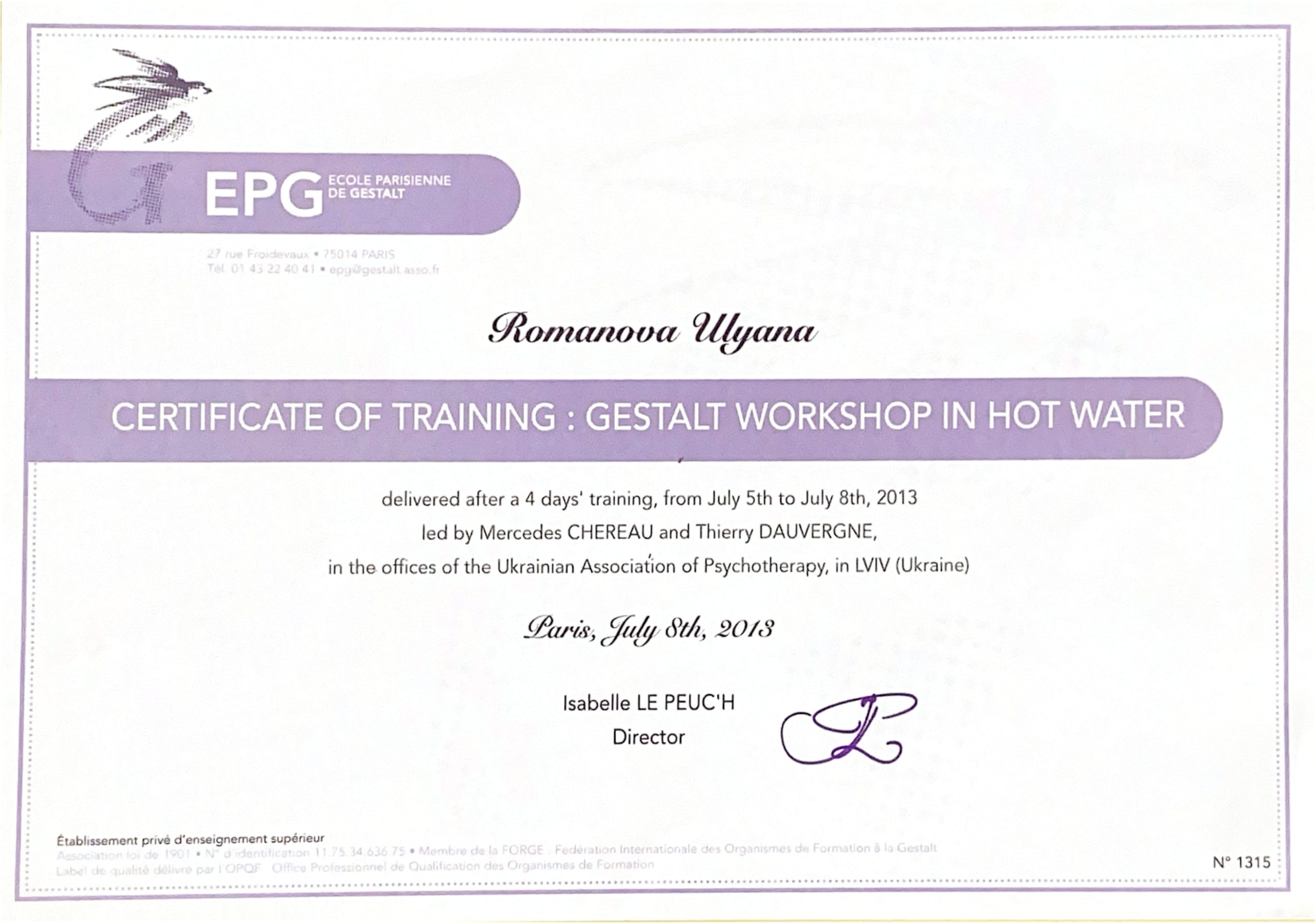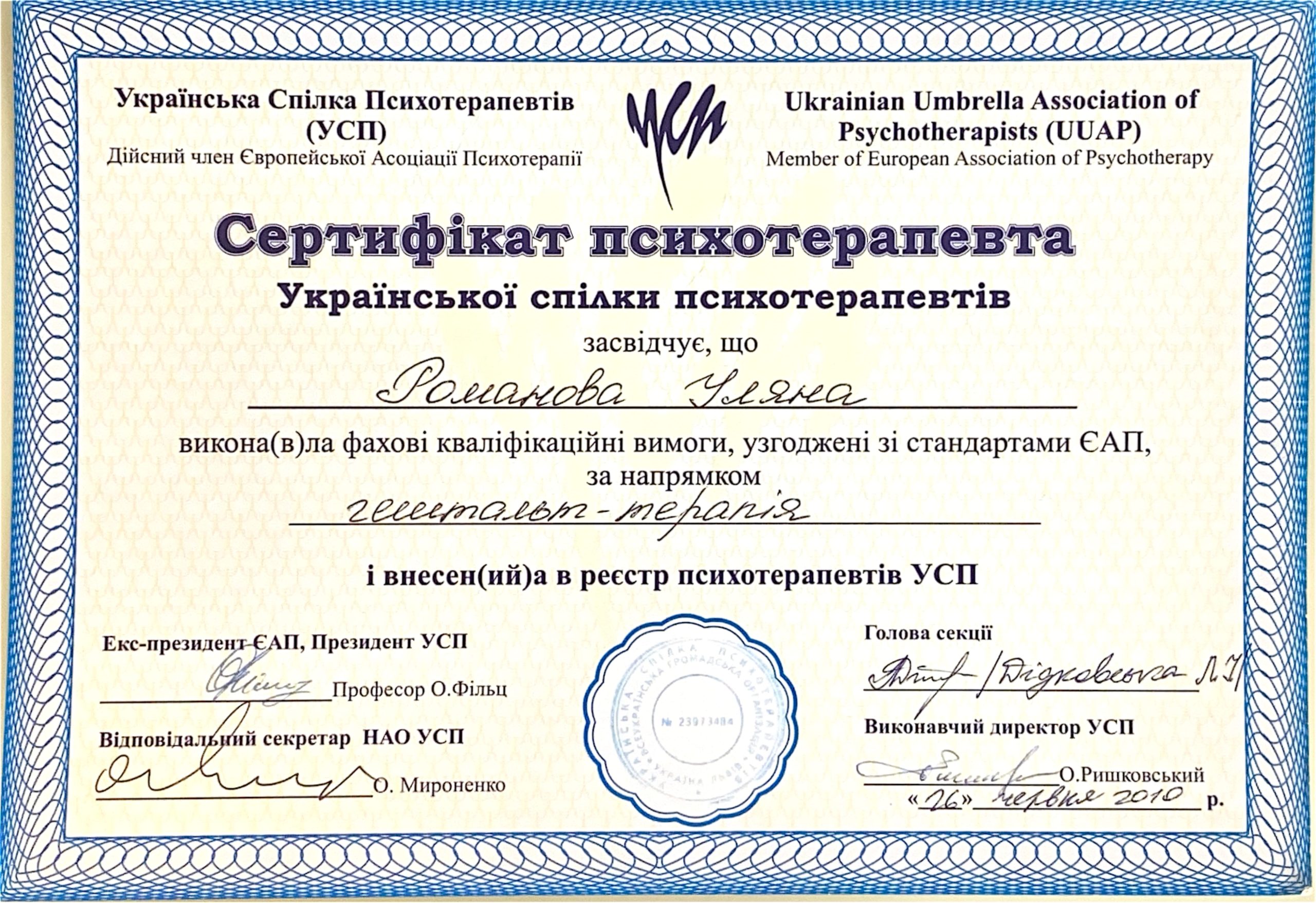 Член УСП, Член ЄАП, Європейський сертифікат з гештальтерапії.