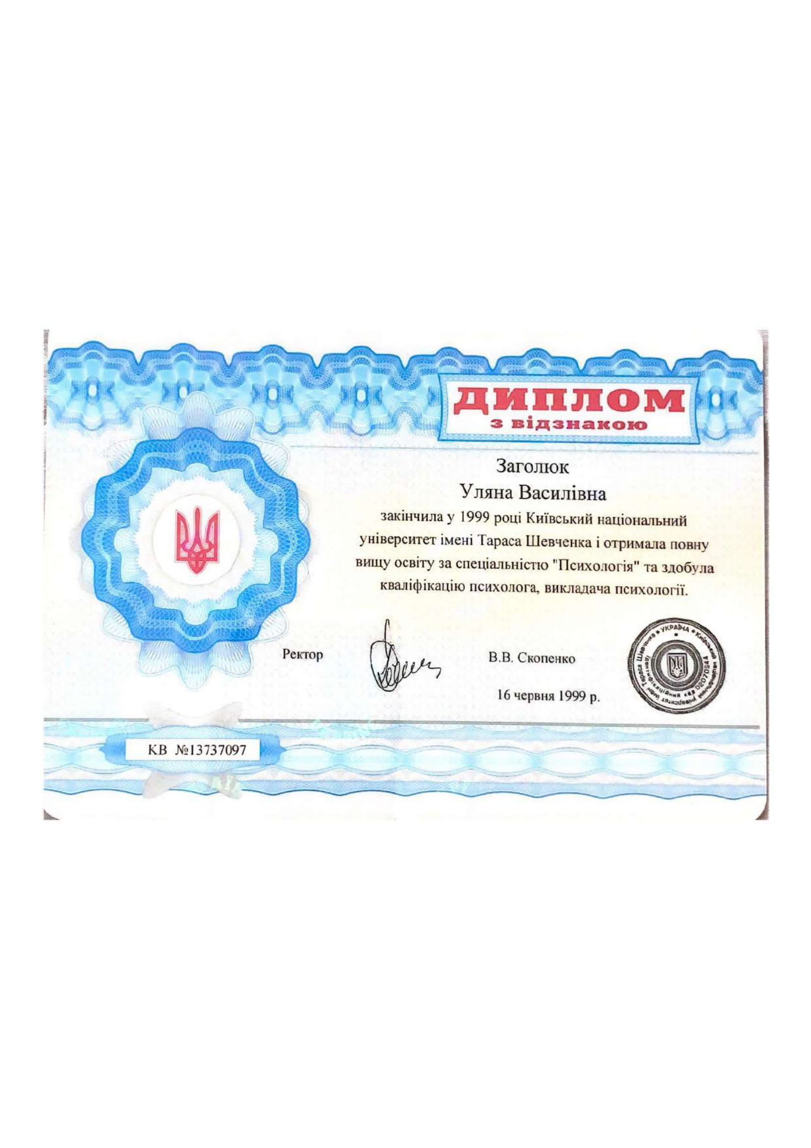1999 р. – Київський Університет ім. ТГ.Шевченко, спеціальність психолог, викладач психологіі.