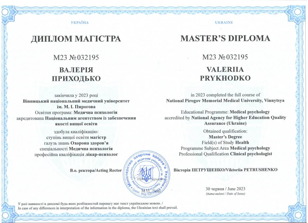 2017-2023р – Вінницький національний медичний університет ім. М.І. Пирогова. Ступінь: магістр. Спеціальність: Медична психологія. Кваліфікація: лікар-психолог.
