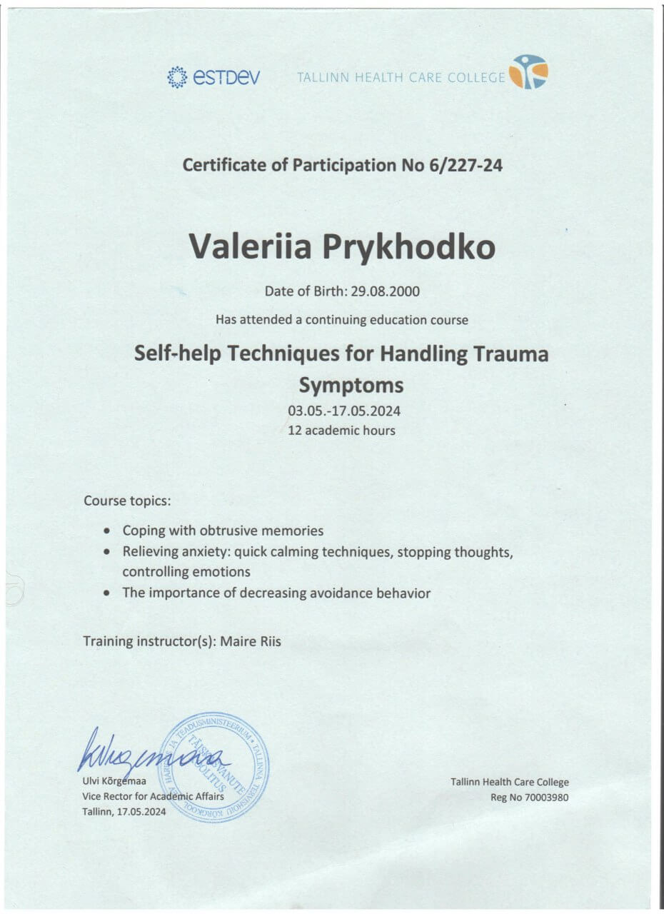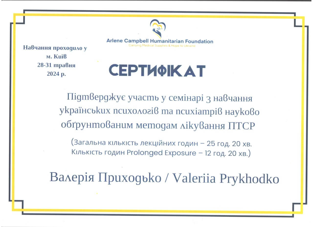 2024р. – Курс підвищення кваліфікації: UpPro School “Основи когнітивно-поведінкової терапії” спеціалізації КПТ-консультант. (180 акад. год. 6 кредитів ЄКТС)