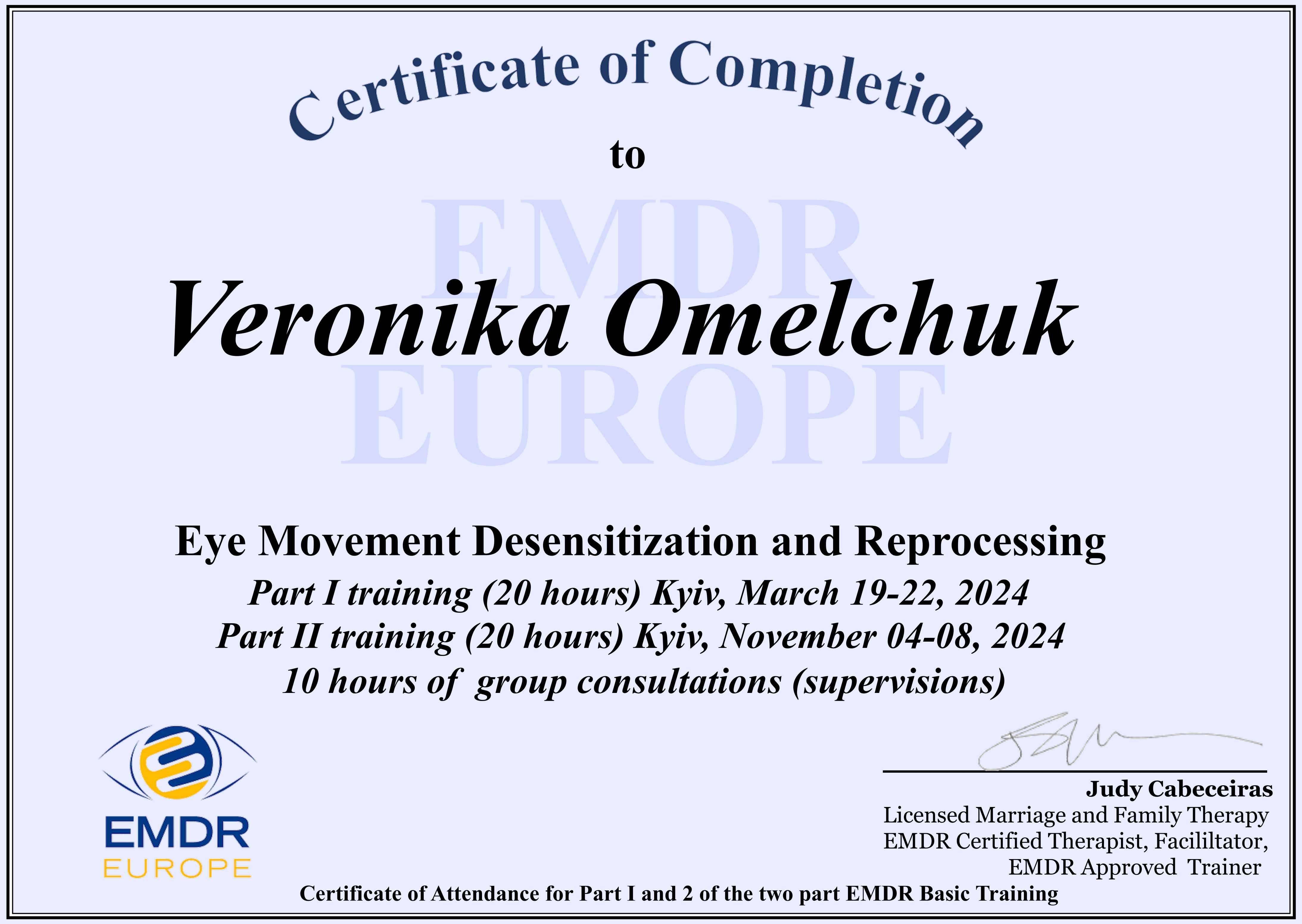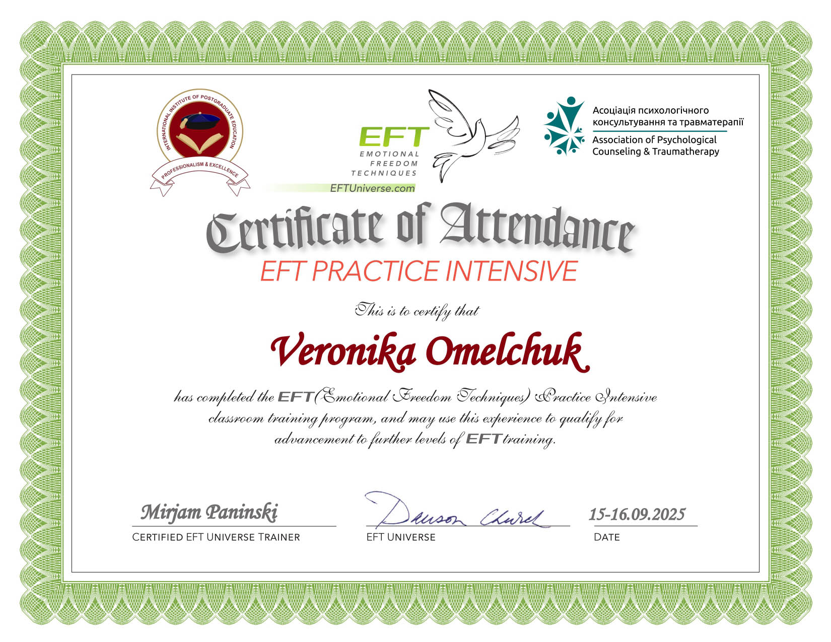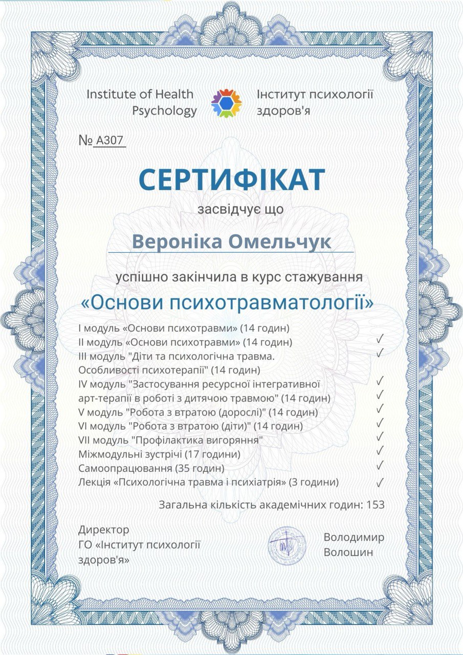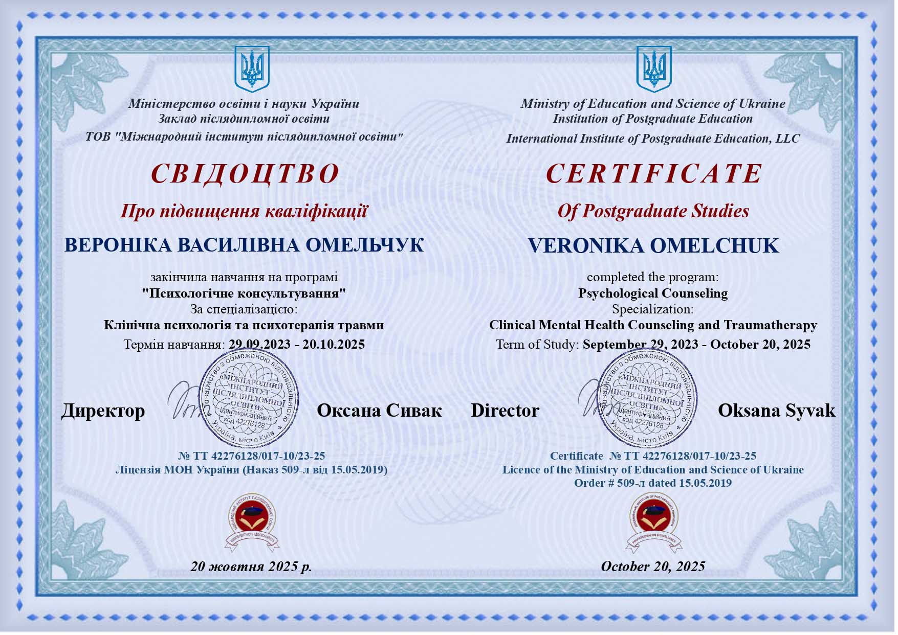 2023 – 2025 — Клінічна психологиня, травматерапевтка, Міжнародний інститут післядипломної освіти