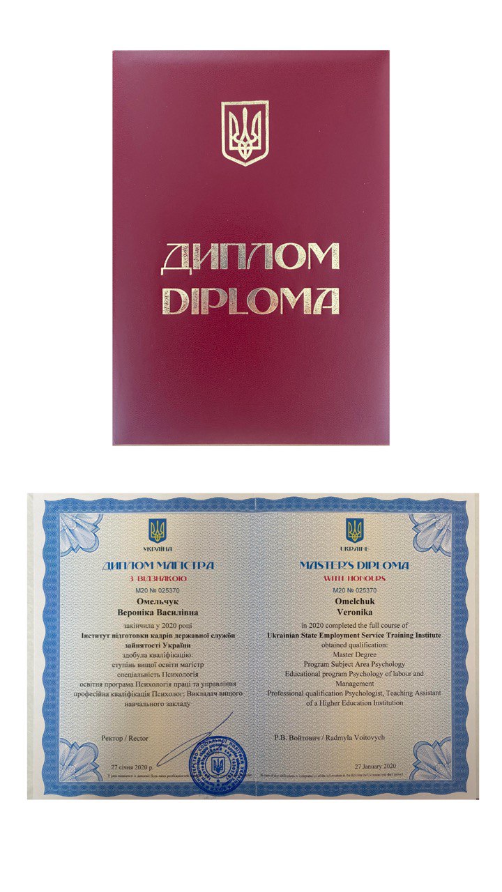 2017 – 2020 — Магістерка психології, Інститут підготовки кадрів державної служби зайнятості України