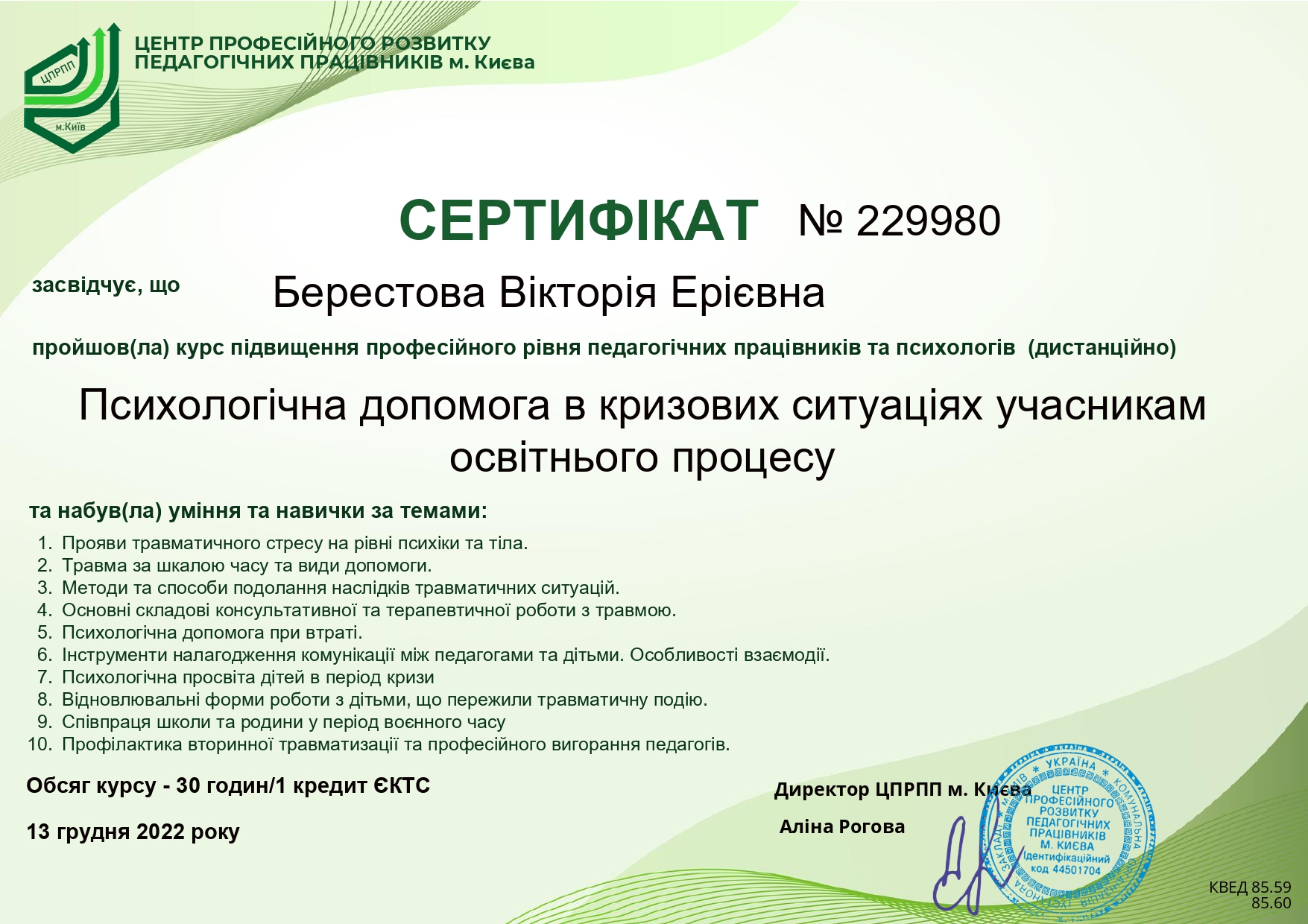 12.2022 – Психологічна допомога в кризових ситуаціях учасникам освітнього процесу, ЦПРПП міста Києва