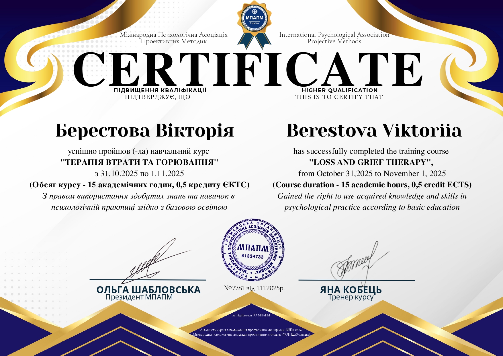 11.2025 – курс “Терапія втрати і горювання”, Міжнародна Психологічна Асоціація Проективних Методик