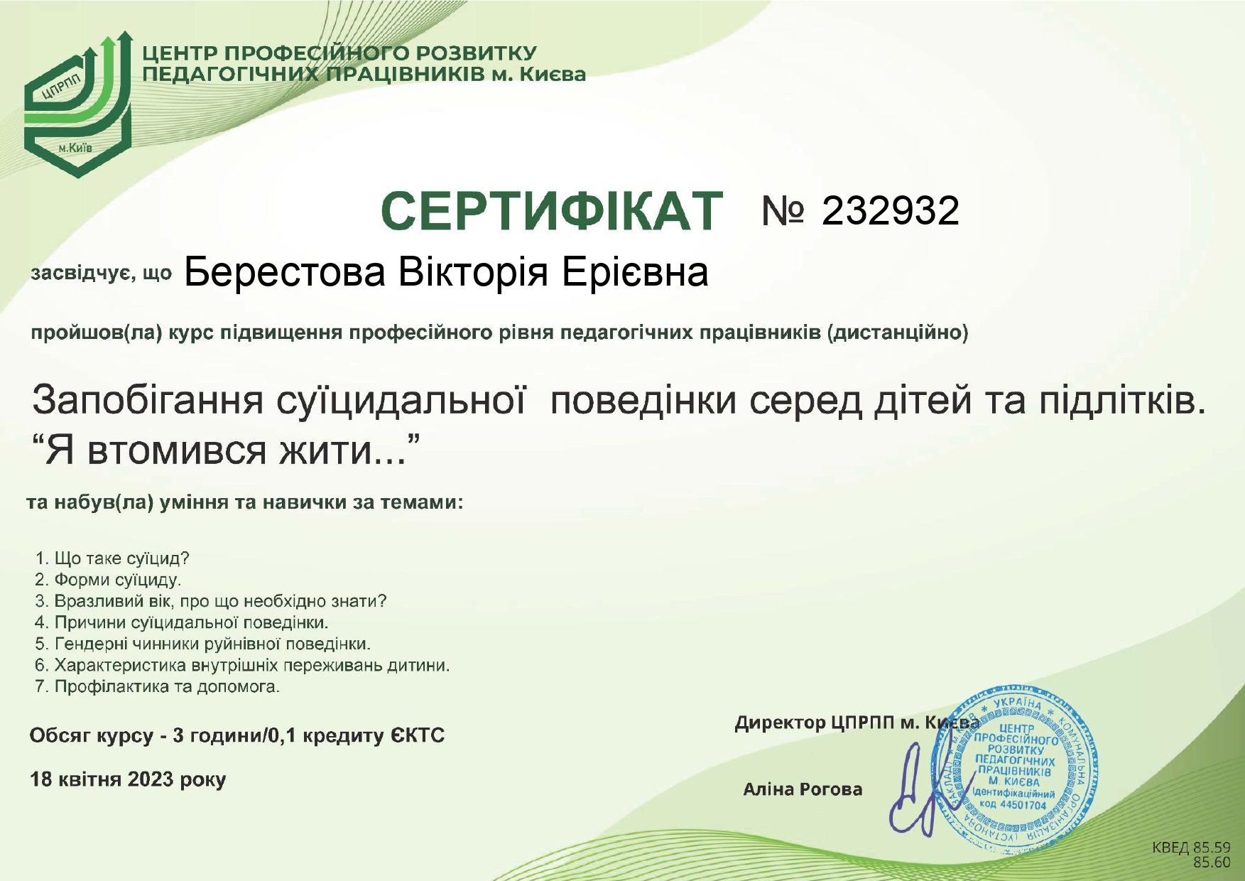 11.2023-04.2024 – “Когнітивно – поведінкова модель у роботі з дітьми і підлітками”, 6-місячна програма у “Київському інституті раціонально-інтуїтивної психотерапії “Я”.