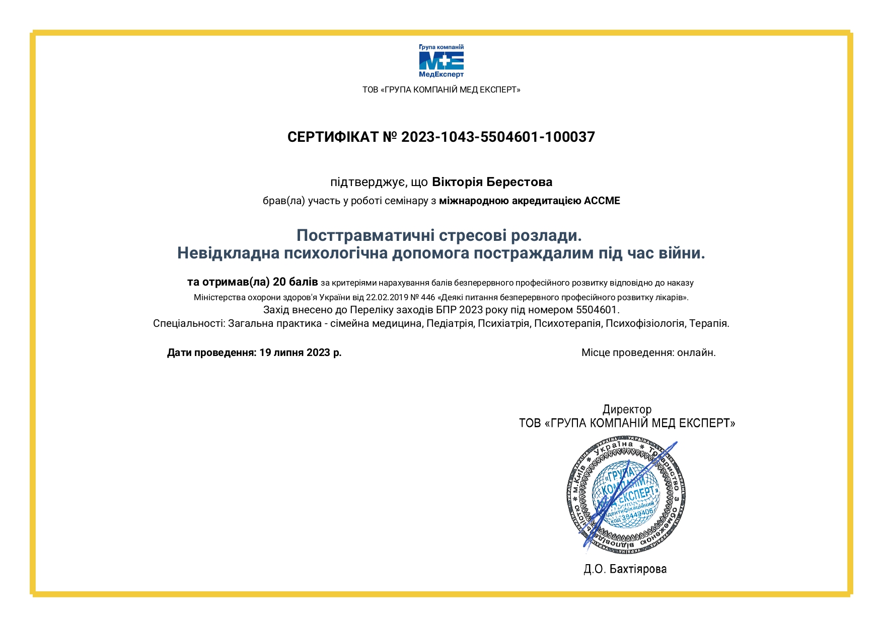 07.2023 – “Посттравматичні стресові розлади. Невідкладна психологічна допомога постраждалим під час війни”, ТОВ «ГРУПА КОМПАНІЙ МЕД ЕКСПЕРТ»