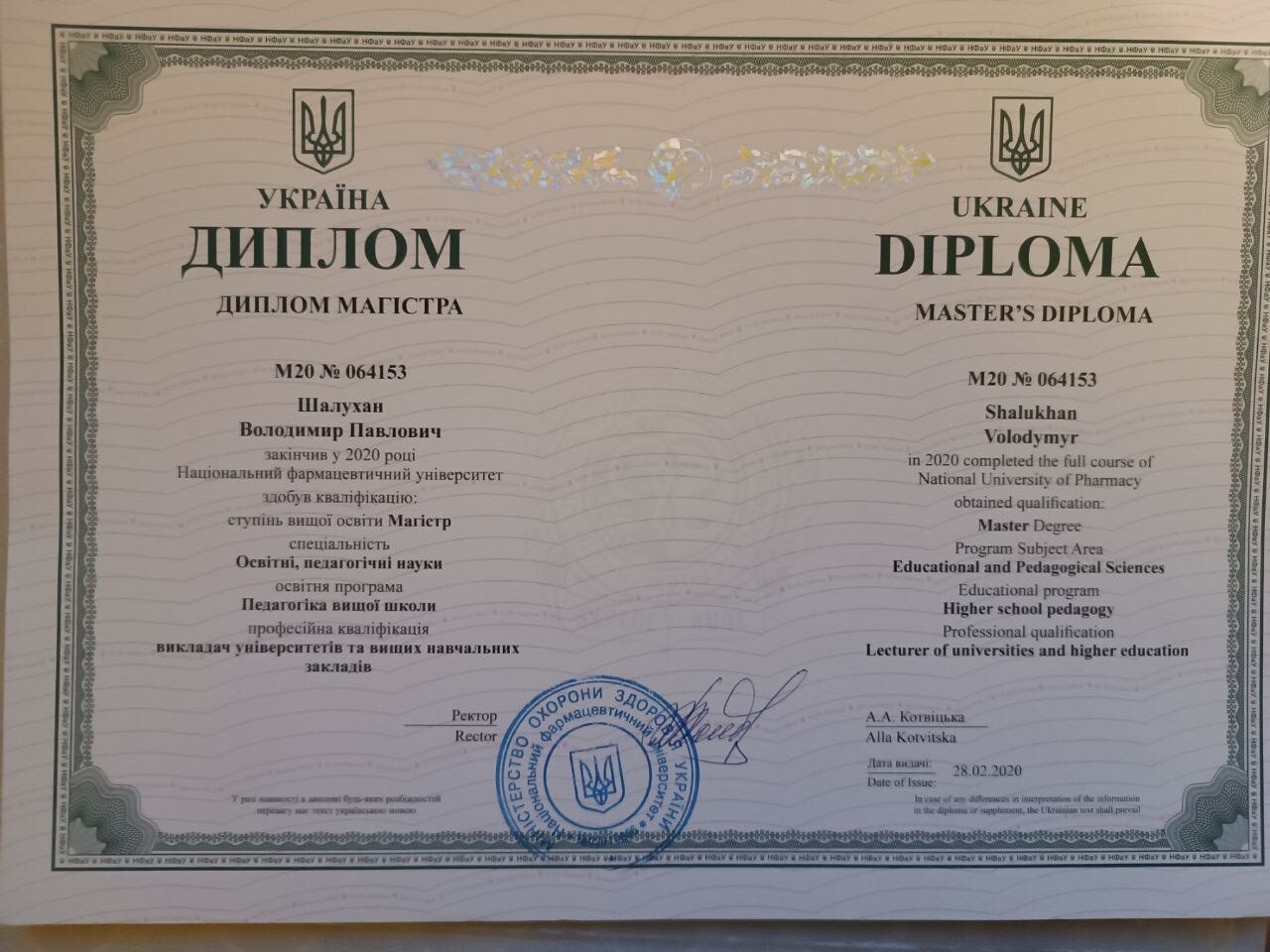 2020 – Магістр освітніх, педагогічних наук, Національний фармацевтичний університет.