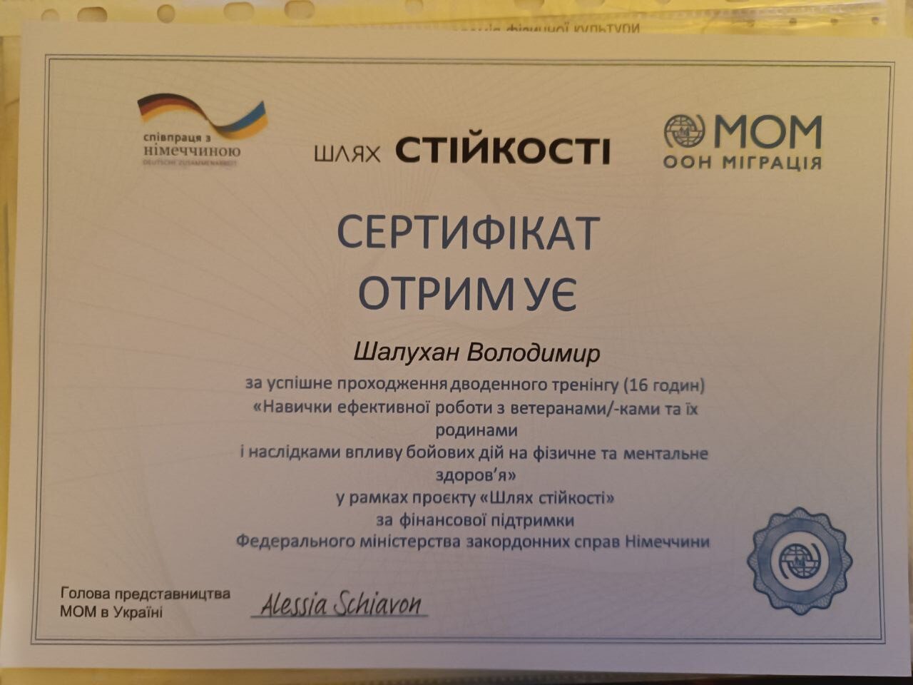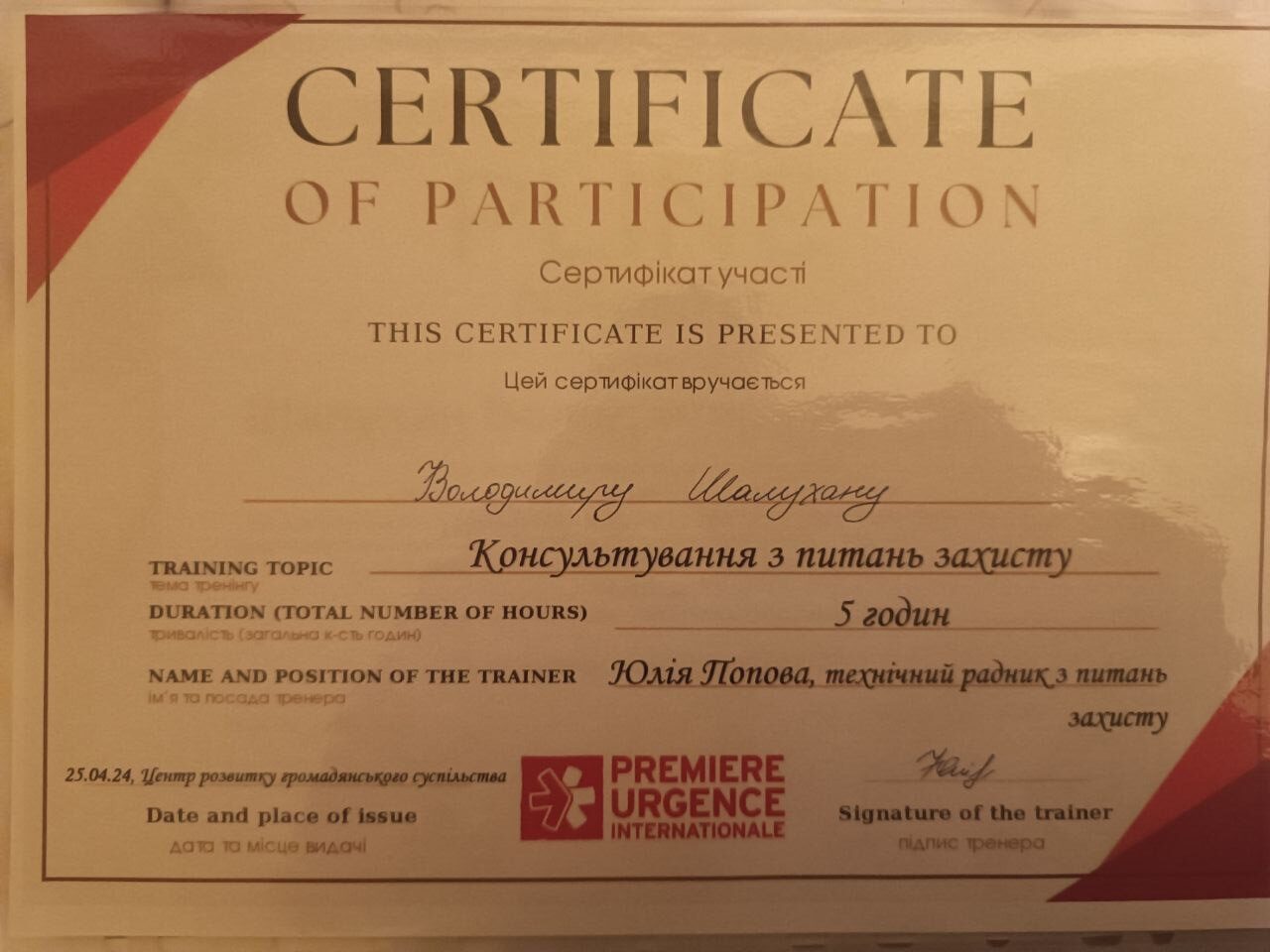 2024 – «Консультування з питань захисту від насильства», Міжнародна організація Première Urgence Internationale.