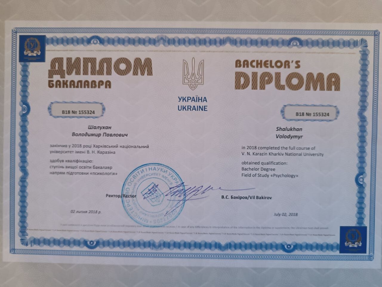 2018 – Бакалавр психології, Харківський національний університет імені В.Н. Каразіна.