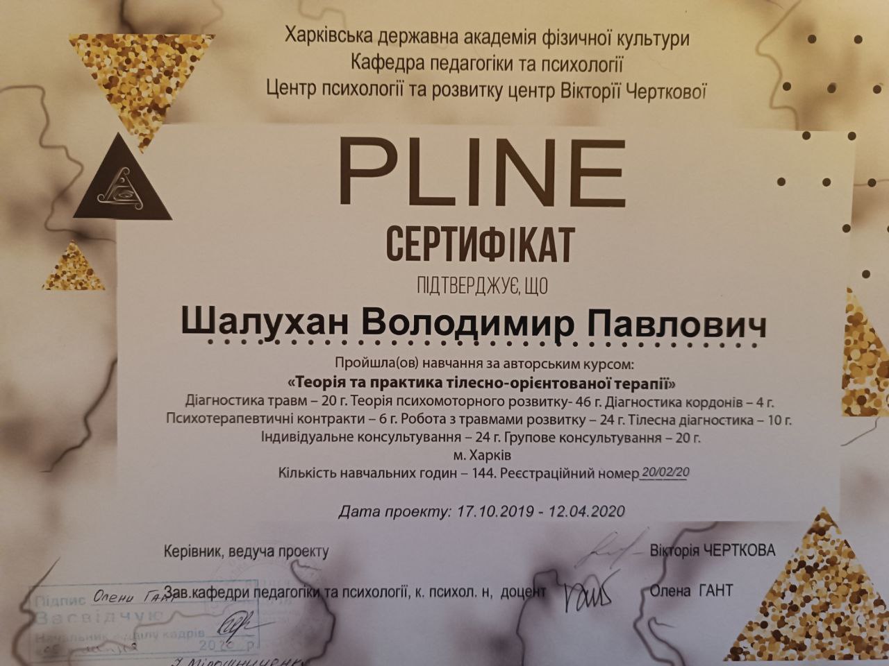 2020 – «Теорія та практика тілесно-орієнтованої терапії», Харківська державна академія фізичної культури, Центр психології та розвитку Центр Вікторії Черткової
