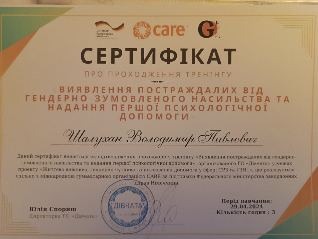 2024 – «Виявлення постраждалих від гендерно-зумовленого насильства та надання першої психологічної допомоги», ГО «Дівчата» у партнерстві з CARE та Федеральним міністерством закордонних справ Німеччини.