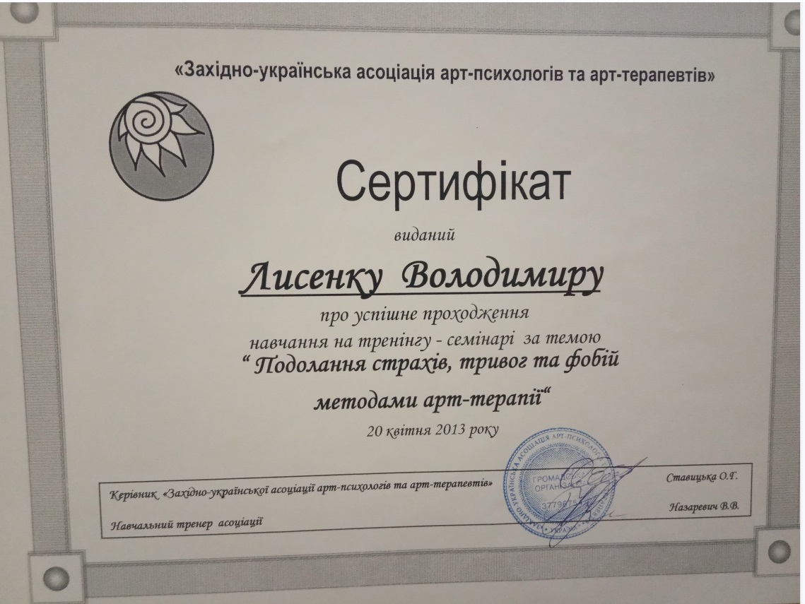 2013 — Тренінг «Подолання страхів, тривог та фобій методами арт-терапії». Західноукраїнська асоціація арт-психологів та арт-терапевтів