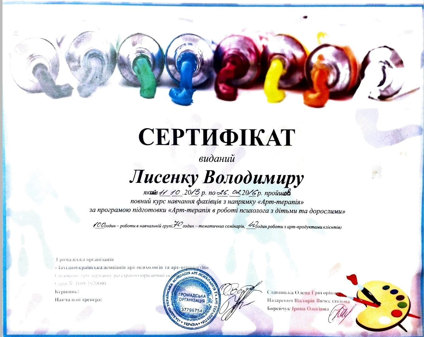 2013–2016 — Повний курс «Арт-терапія в роботі психолога з дітьми та дорослими» Західноукраїнська асоціація арт-психологів та арт-терапевтів