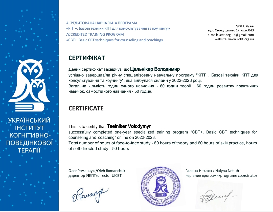 2022–2023 — Програма «КПT+. Базові техніки КПТ для консультування та коучингу» Український інститут когнітивно-поведінкової терапії