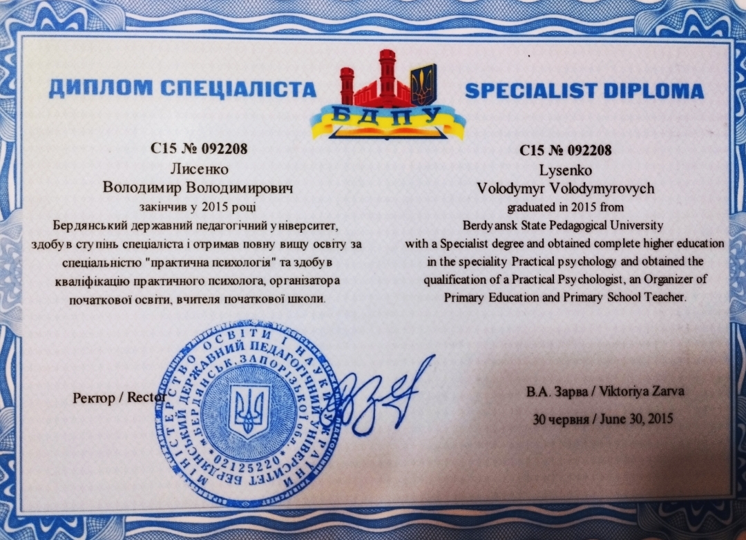 2015 — Спеціаліст психології, спеціальність “Практична психологія”, Бердянський державний педагогічний університет