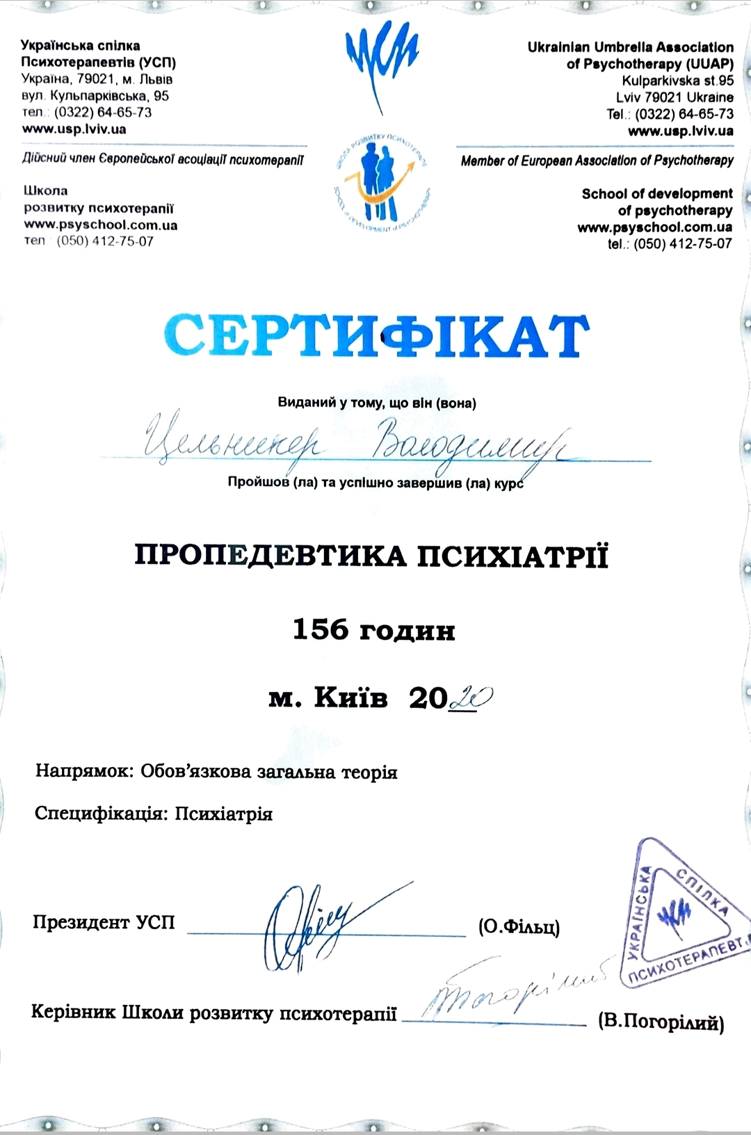 2020 — Курс «Пропедевтика психіатрії», Школа розвитку психотерапії, Українській спілка психотерапевтів (УСП), м. Київ